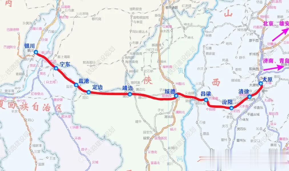 作为青银通道的重要组成部分,该线路东起太原南站,经山西太原、吕梁,跨越黄河后接入陕西绥德西站,与在建延榆高铁相连。山西段新建线路约314公里,陕西段53.8公里。