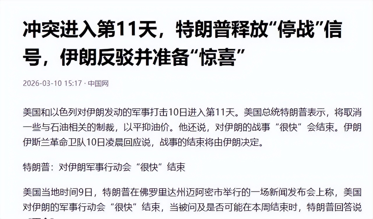 但伊朗继续通报反击成果,包括针对海湾美军设施的行动。这让分析人士认为,战争短期内难以完全停止。特朗普提到可能与伊朗谈判,但强调取决于条件,而伊朗方面明确表示新任最高领袖不会考虑对话。