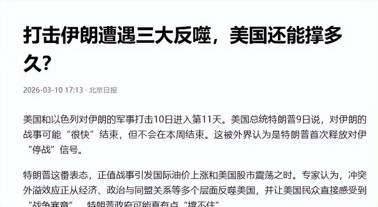 美国国内同样面临多重压力。战争部长赫格塞斯表示,战斗仍在继续,直到敌人被彻底击败。但特朗普稍后在佛罗里达的讲话中提到,行动不会在本周完全结束,还有更多工作要做。这种前后表述的细微调整,显示美国在平衡军事成果与尽快收手的现实需求。