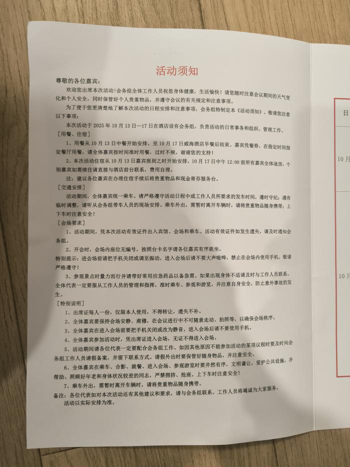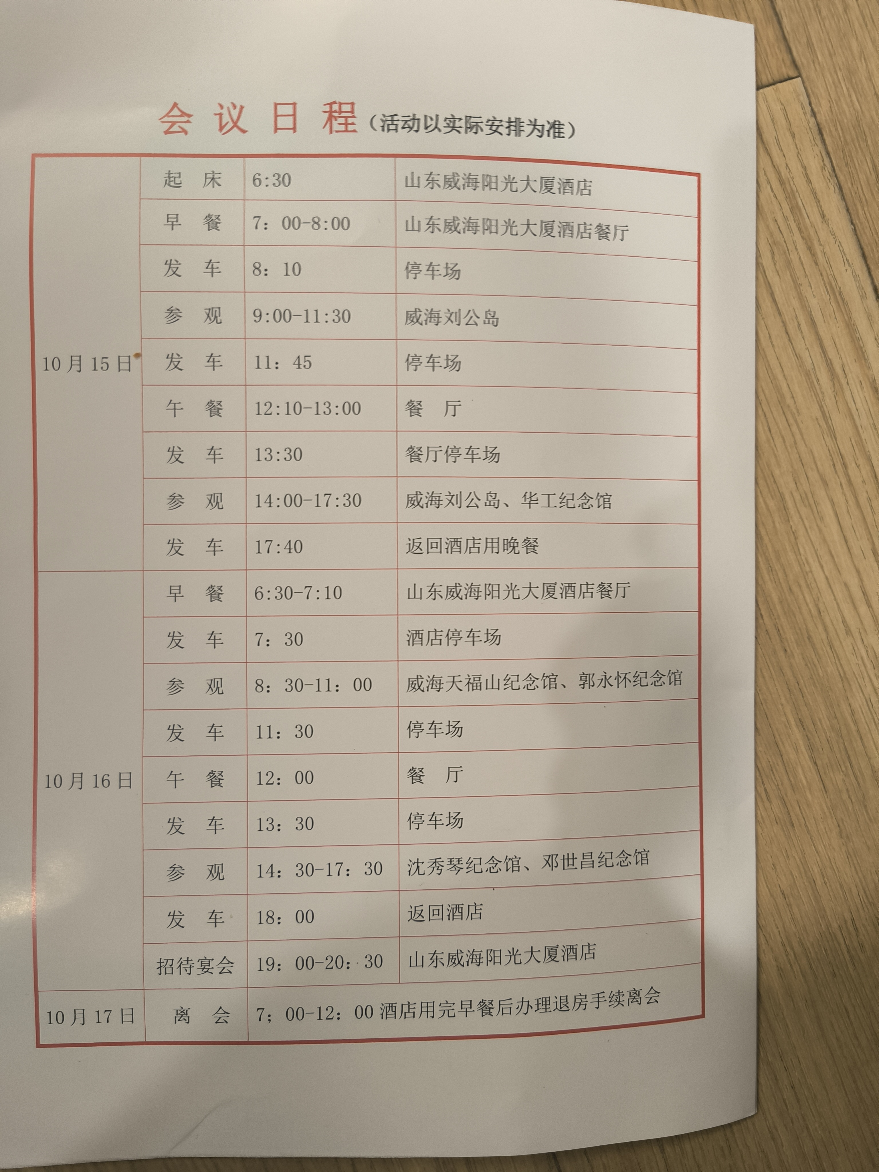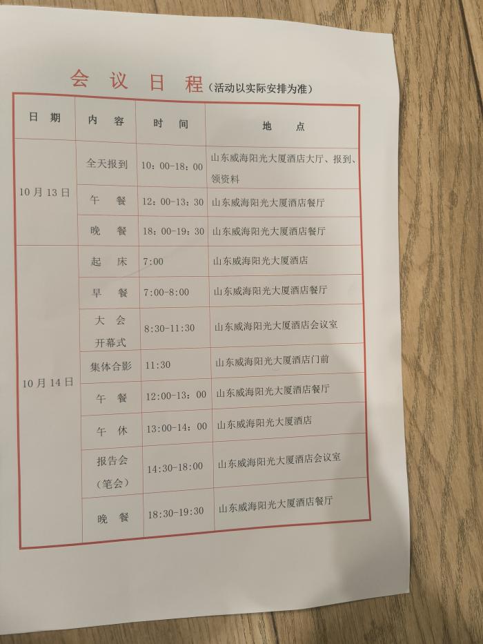 10月13日为报到日,与会嘉宾在威海阳光大厦酒店办理入住手续并领取会议资料。随后的几天安排了多种形式的活动。