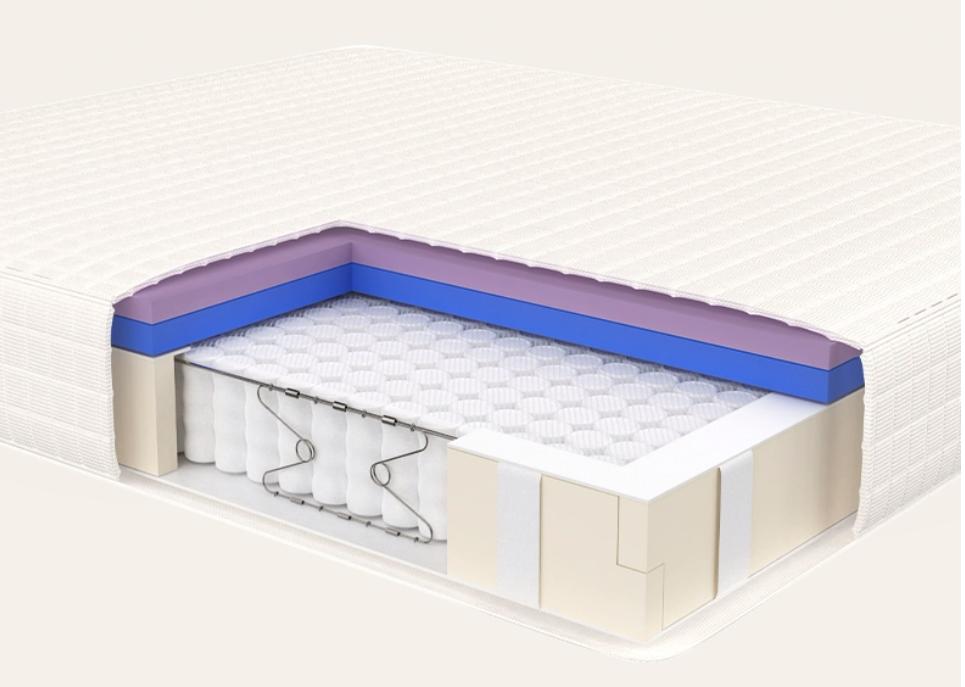坚果3代床垫采用科学分层复合结构:表层为2cm无感高透气记忆棉,凭借慢回弹特性实现身体各部位精准包裹与贴合;中层是2.5cm生物基小蓝垫,含25%大豆油提取物,以适度厚度提供稳固支撑力;底层由840个6.5圈0胶水独立袋装弹簧构成,采用四叶型排列设计,紧密贴合人体自然曲线。