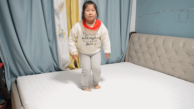 来看看栖作坚果3代的支撑表现,二宝在上面本蹦跳,可以清晰的看到床垫精准的弹性反馈。实际对比体验,其缓冲效能与回弹韧性要比我原来的床垫强太多了。