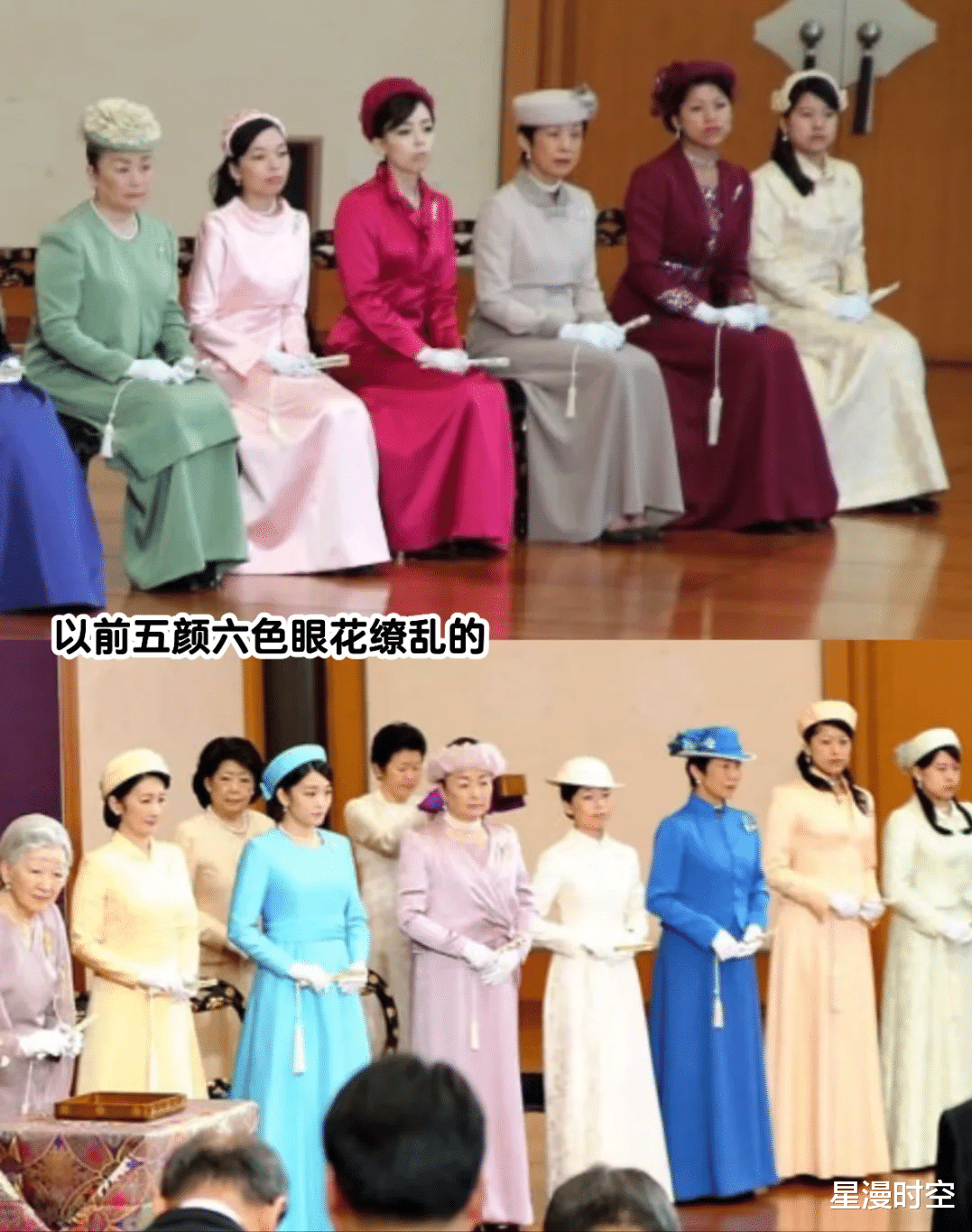 日本王室的服装向来被吐槽“老气古板”,一旦有大型活动,每个人都一身纯色系打扮,坐在一起,简直像打翻了的调色盘,眼花缭乱的。