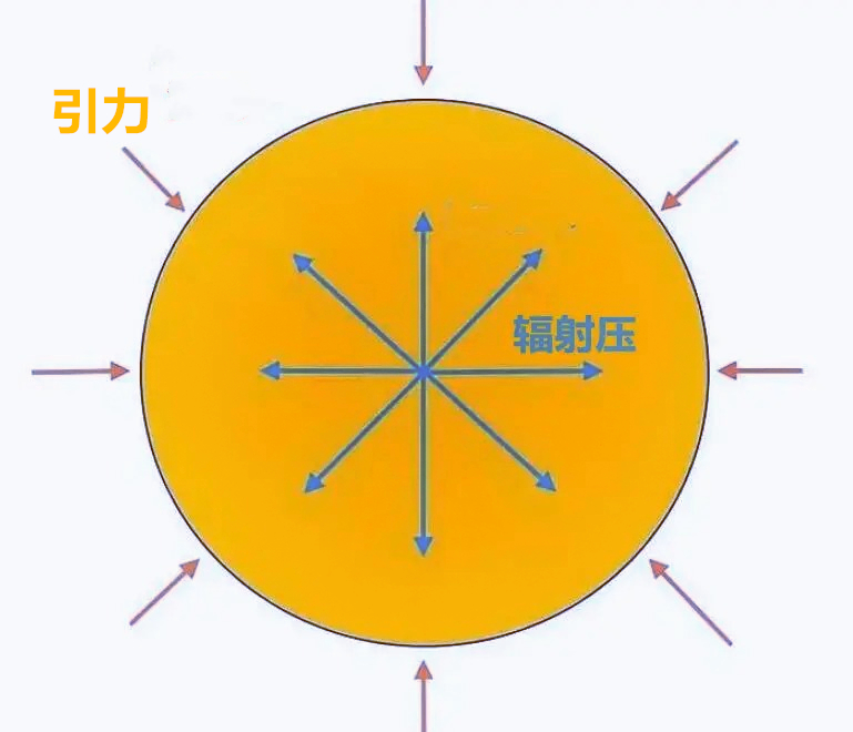 在恒星内部,存在着两种力量的较量,一种是恒星自身的引力,其方向是向内,它会“压缩”恒星,让其体积变小,另一种则是恒星核心的核聚变释放出的能量所产生的辐射压,其方向是向外,它会把恒星的体积“撑”大,当这两种力量达成平衡时,恒星就会稳定下来。