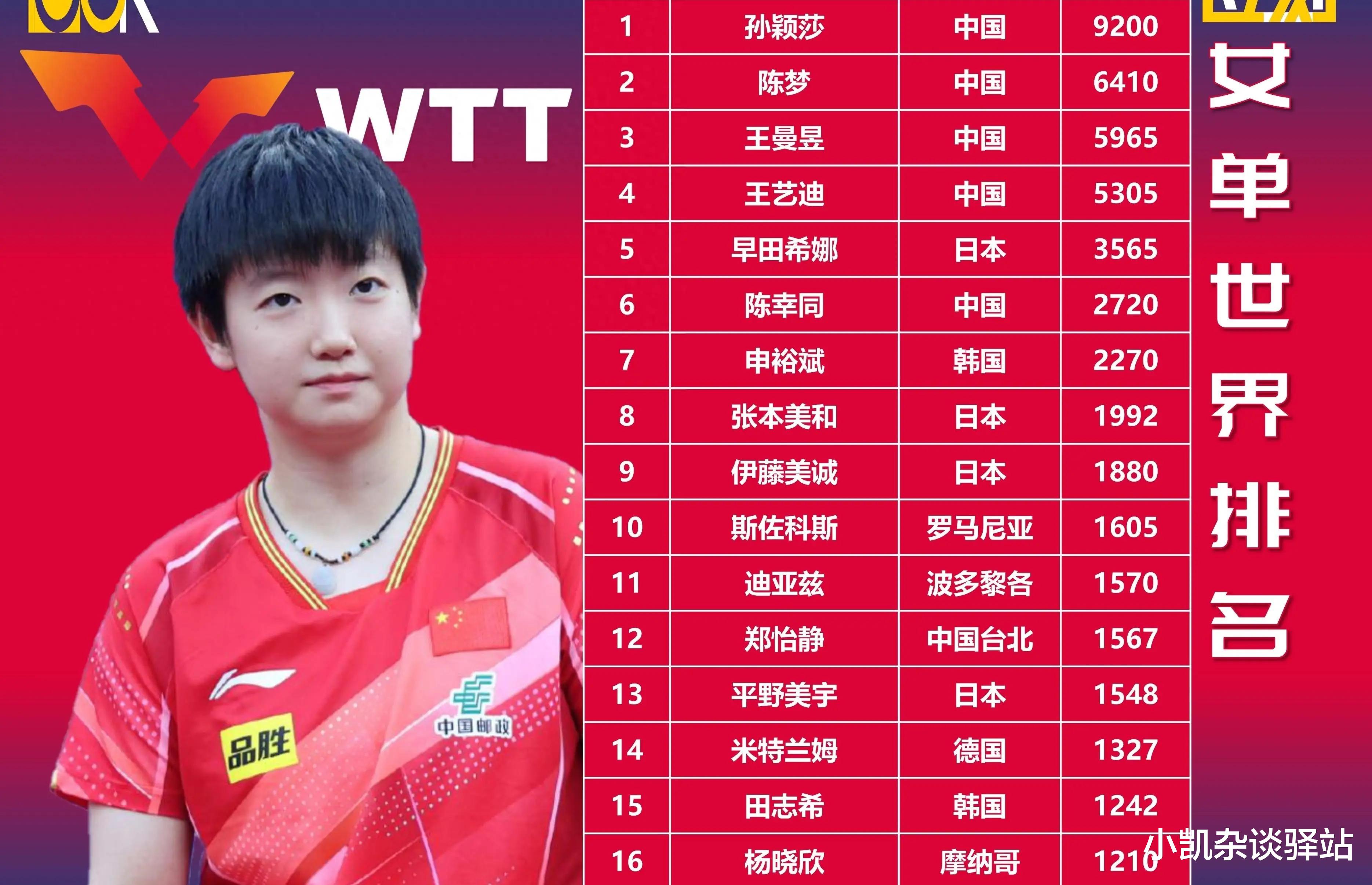 女子单打方面,孙颖莎以9000分的绝对优势位居榜首,成为当之无愧的女子单打世界第一;陈梦以8950分紧随其后,排名第三的是王曼昱,她以8900分位列第四名。除了这三人之外,还有伊藤美诚(8650分)、早田希娜(8600分)和石川佳纯(8550分)等名将位列前十。