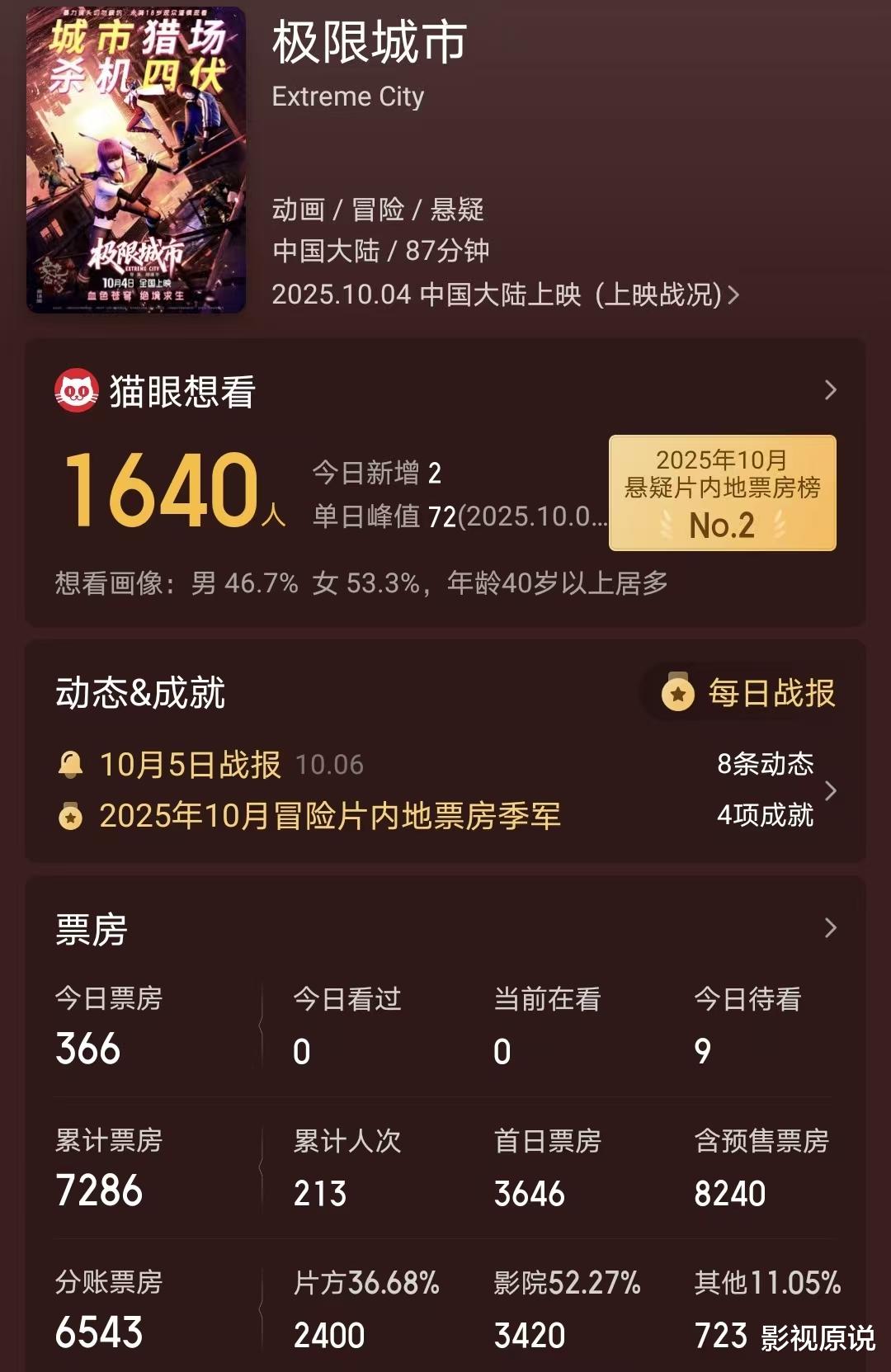 该片是一部悬疑冒险动画,于10月4日开始正式上映,到现在已有四天时间,而它的累计总票房却还没有达到8000元人民币,观影人次是213人,感觉他们都是剧组人员。