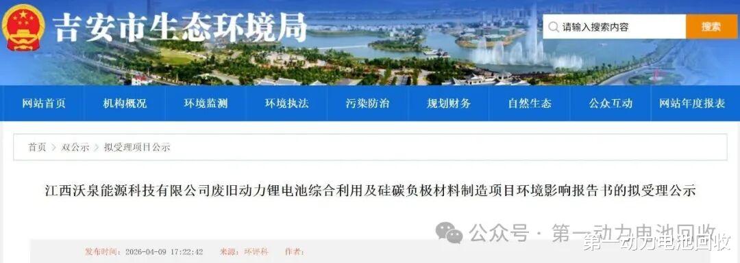 第一动力电池回收消息,近日,江西省吉安市生态环境局发布了《江西沃泉能源科技有限公司废旧动力锂电池综合利用及硅碳负极材料制造项目》环境影响报告书的拟受理公示。