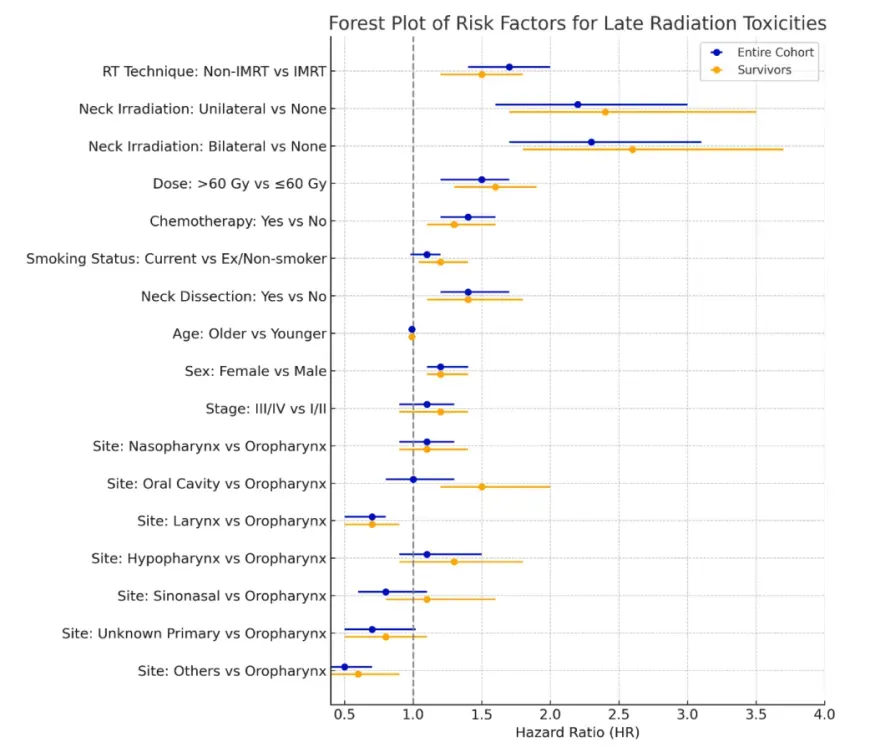 4650例无复发且存活≥2年的幸存者中,上述HR点估计仅出现微小漂移:非IMRTHR=1.73,双侧颈照HR=2.38,口腔癌HR=1.44,女性HR=1.30,方向与显著性一致,P值仍≤0.003。作者认为,这排除了“毒性发生率被隐匿复发稀释”的可能性,证实危险因素一旦在诊断时锁定,其效应可持续至治愈后第五年,为后续“治愈后风险分层随访”提供时间窗口。