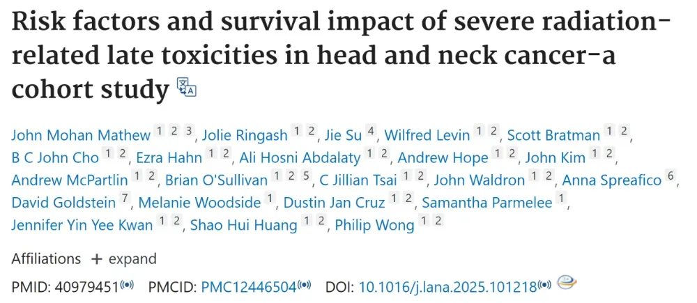 Mathew JM, Ringash J, Su J, et al. Risk factors and survival impact of severe radiation-related late toxicities in head and neck cancer-a cohort study. [J/OL]Lancet Reg Health Am. 2025;50:101218. Published 2025 Sep 3. doi:10.1016/j.lana.2025.101218