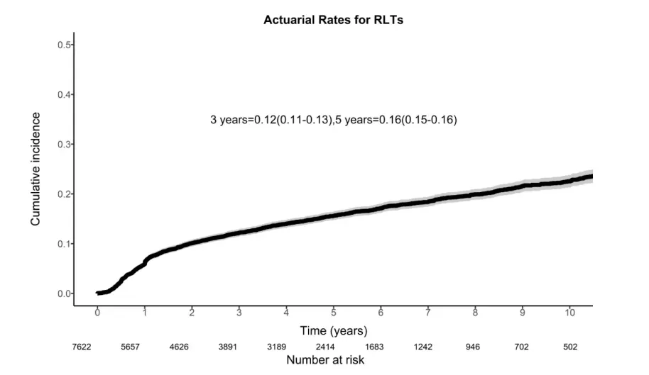 整条队列7622例中位随访5.2年,958例出现≥3级RLT,竞争风险模型算出5年累积发生率16%(95%CI:15–16),并以每年≈1%的斜率继续爬升;其中骨坏死占34%(325/958),需管饲吞咽困难16%(157/958),外周神经病变16%(153/958),纤维化/淋巴水肿13%(122/958),四者合计>75%。作者强调,该曲线把“死亡或复发”设为竞争事件,因此16%是“在无瘤且存活”人群中真实可累积的毒性概率,远高于既往把毒性作为“随访副产物”报告的8–10%。