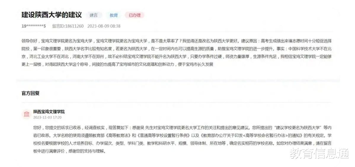 近年来,有网友提出筹建“陕西大学”,比如有的网友说以宝鸡文理学院为基础筹建陕西大学,宝鸡文理学院曾在该建议中答复指出:“大学名称的使用须遵照教育部《高等教育法》和《普通高等学校设置暂行条例》以及《教育部办公厅关于印发<高等学校命名暂行办法>的通知》的有关规定。学校校名要根据学校的人才培养目标、办学层次、类型、学科门类、教学和科研水平、规模、领导体制、所在地等,确定名实相符的学校名称。”