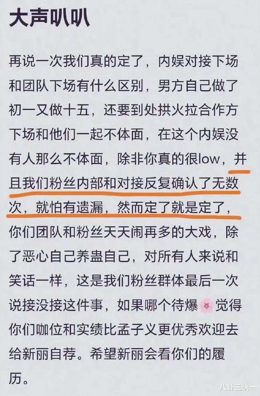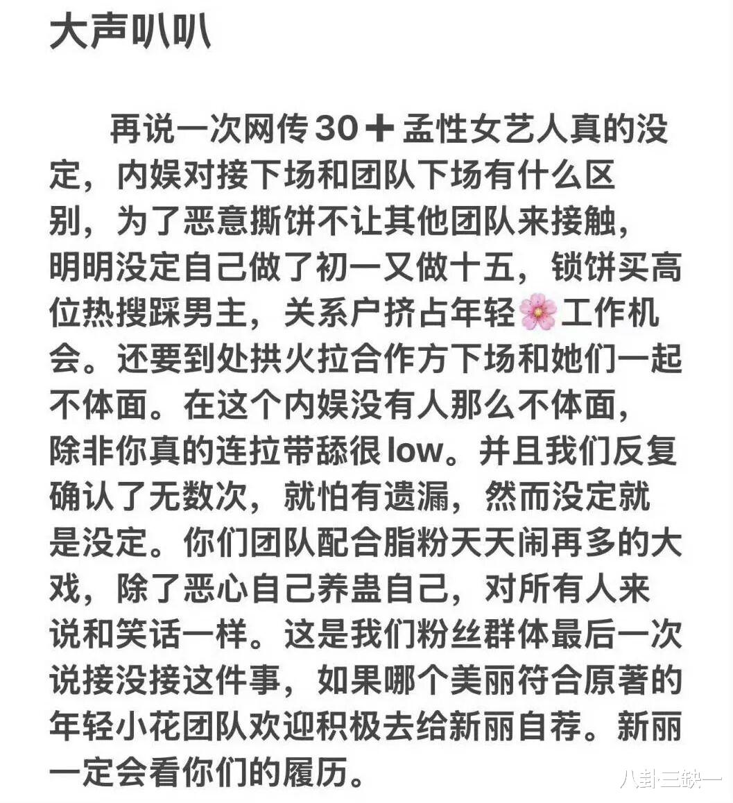 一边喊着“网传30+孟姓女艺人真的没定!反复确认无数次,没定就是没定”,吐槽对方锁饼踩人、拱火不体面,呼吁年轻小花主动自