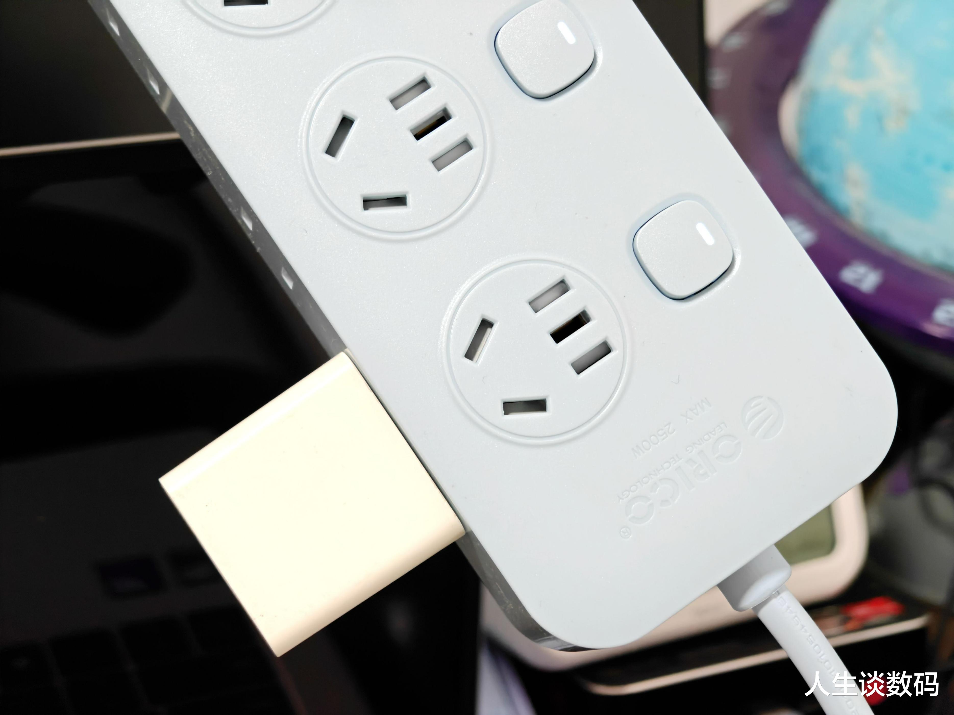 最让我惊喜的是接口间距设计,每个插孔间距42mm,即使是体积较大的电源适配器,也能轻松插入,不会出现插头“打架”的情况。实测同时连接笔记本、手机、平板、台灯、加湿器5台设备,接口之间互不干扰,充电和用电都稳定在线。