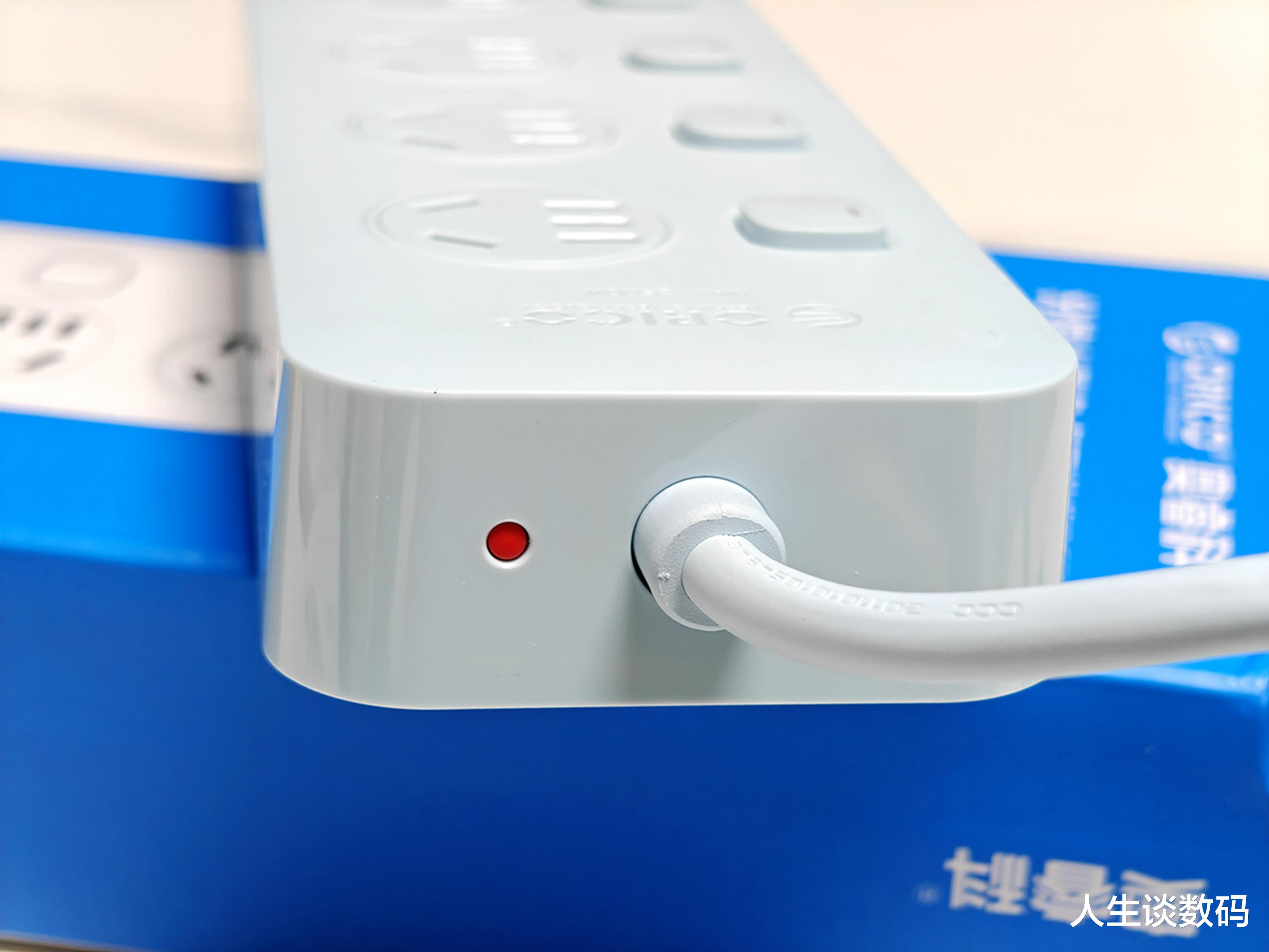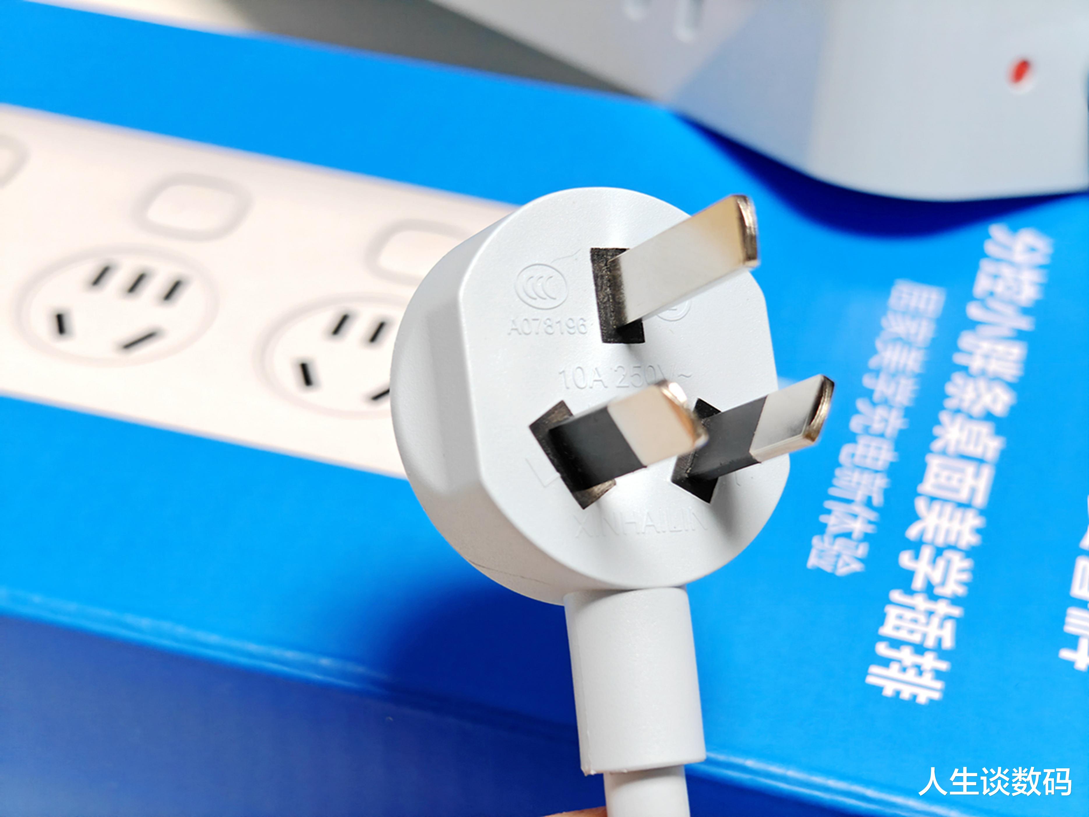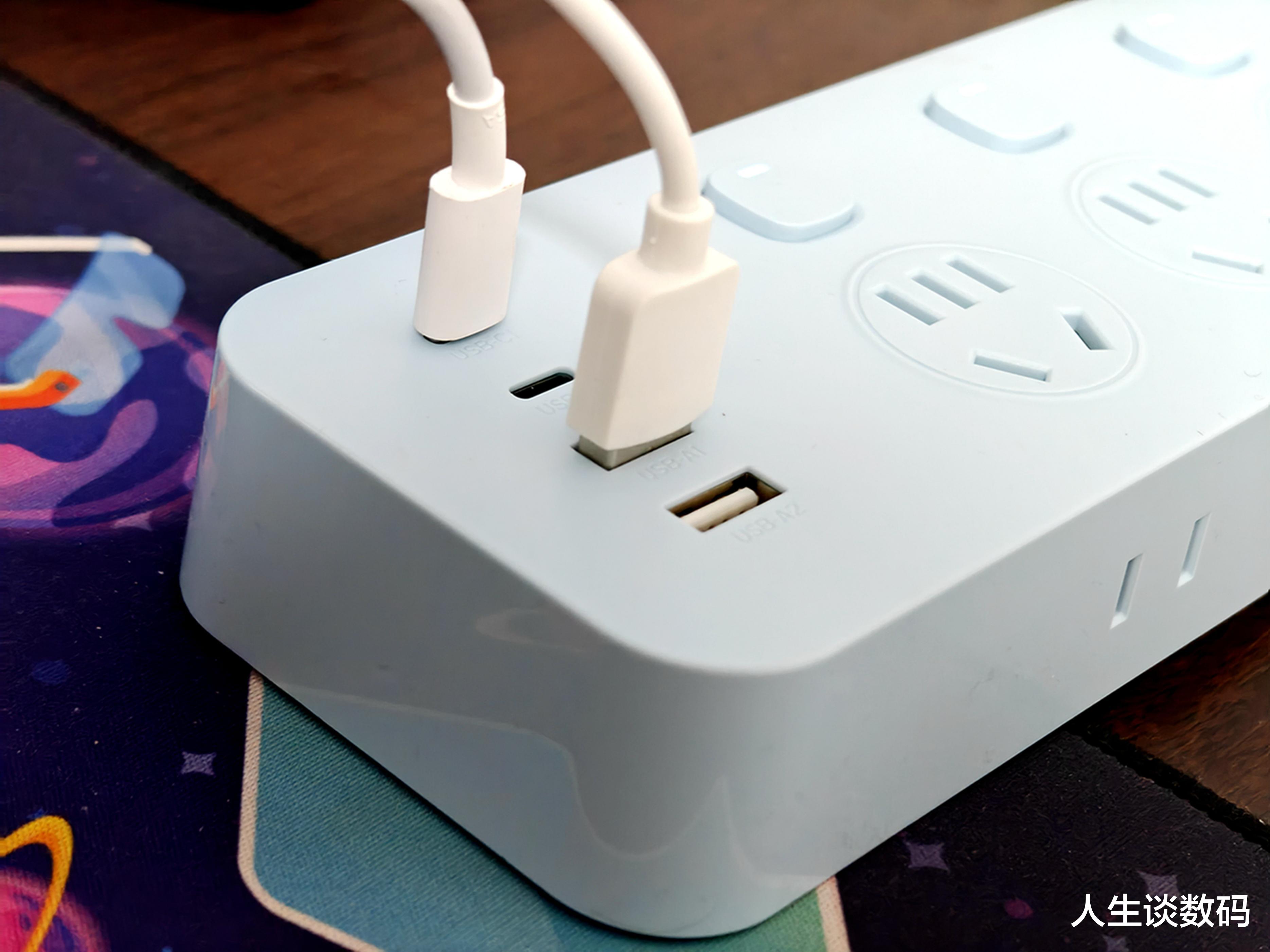 它采用简约现代的设计风格,没有多余的繁杂装饰,线条流畅利落,机身只有239*72*30mm,拿在手里小巧精致,完全不像传统插排那样笨重。更贴心的是提供了白、蓝、紫、黑四种配色,我选的蓝色款放在原木色桌面上,瞬间成为点睛之笔,再也不用把插排藏在桌底了。
