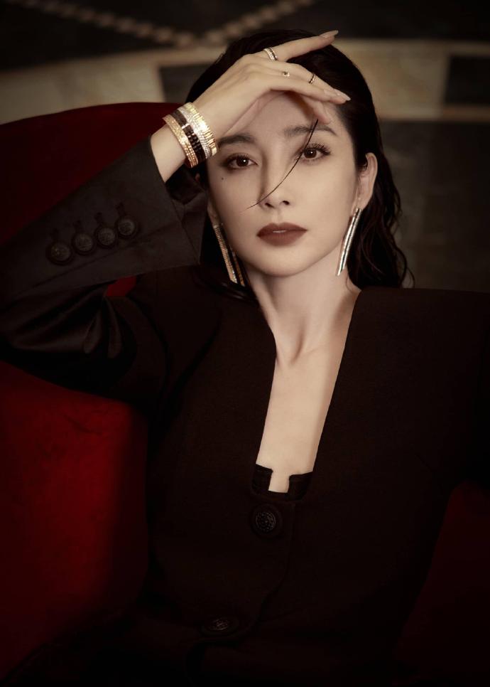 湿发造型衬得她轮廓更利落,长款钻饰耳坠与叠戴的珠宝相衬,冷硬金属与柔润光泽撞出贵气;她或插兜站在鎏金背景前,或抬手倚在红沙发上,连指尖的戒指都成了酷飒里的精致注脚。没有刻意凹出的攻击性,是西装的刚裹着露肤的柔,是珠宝的奢衬着松弛的态,让全黑造型成了 “刚柔并济” 的风格载体。