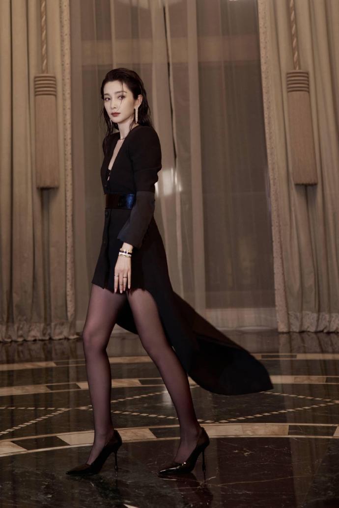 李冰冰一袭黑西装裙亮相,把 “凌厉气场” 和 “柔媚细节” 揉得恰到好处 —— 垫肩撑出的直角肩自带飒感,深 V 剪裁与腰间镂空又漏出轻熟性感,不对称裙摆前短后长,露出的腿腕裹着黑丝,每一步都踩着 “冷艳与慵懒” 的平衡点。