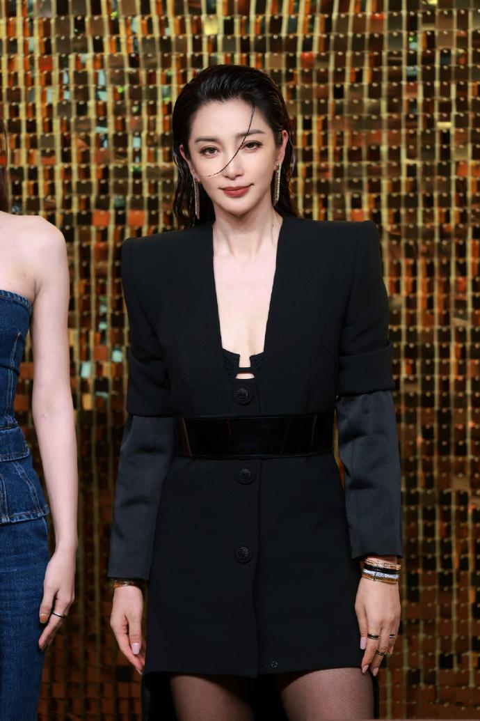 李冰冰一袭黑西装裙亮相,把 “凌厉气场” 和 “柔媚细节” 揉得恰到好处 —— 垫肩撑出的直角肩自带飒感,深 V 剪裁与