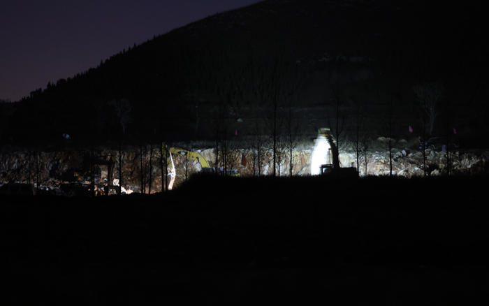 整个项目唯一的建筑是两层简易板房构成的“项目部”,门前砂石路上安装有一台地磅。项目区由东向西呈带状分布,东部为一期工程,西部为二期工程。目前一期项目区并没有机械设备施工,但大面积山体已被挖开裸露着碎石;二期项目区正在开采矿石,已挖出一条深约两米,宽约八米的深沟。