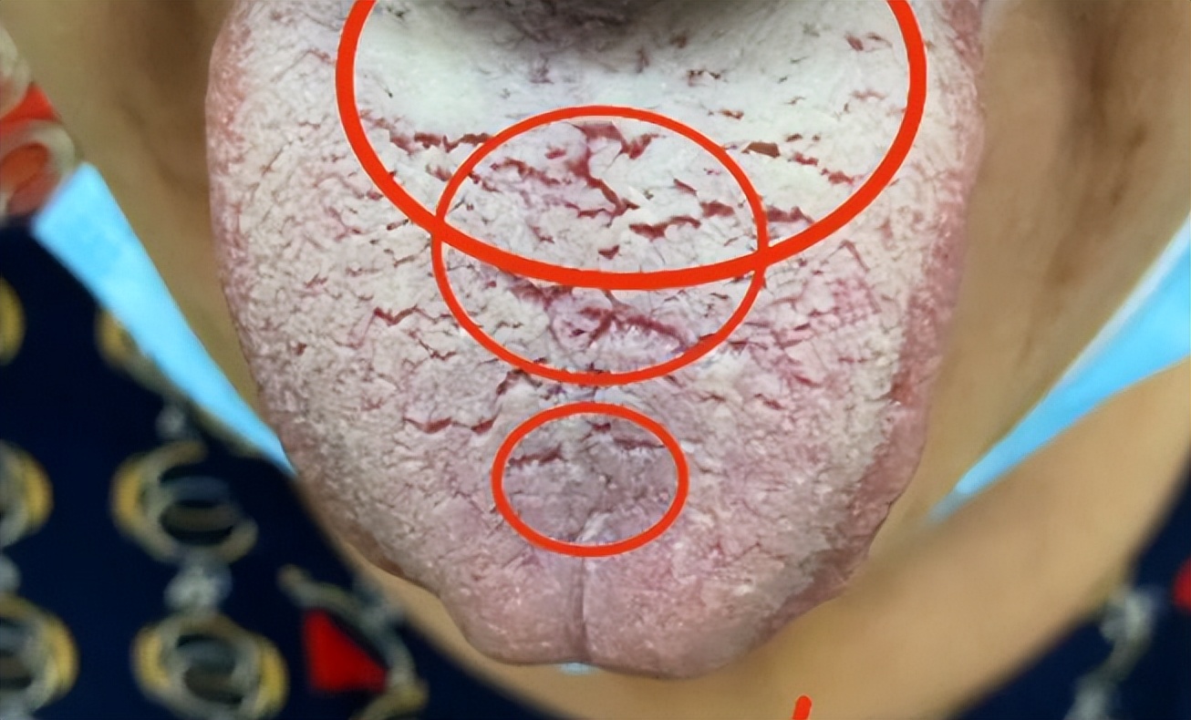 ⑥裂纹舌:舌面上有裂沟,且裂沟中没有舌苔覆盖的现象称为裂纹舌。这通常是由于精血亏损、津液耗损、舌体失去滋养所致,通常与精血亏损有关。此外,在健康人群中,大约有0.5%的人舌面上有深沟,称为先天性舌裂,其裂沟中通常有舌苔覆盖,身体没有其他不适,与裂纹舌不同。