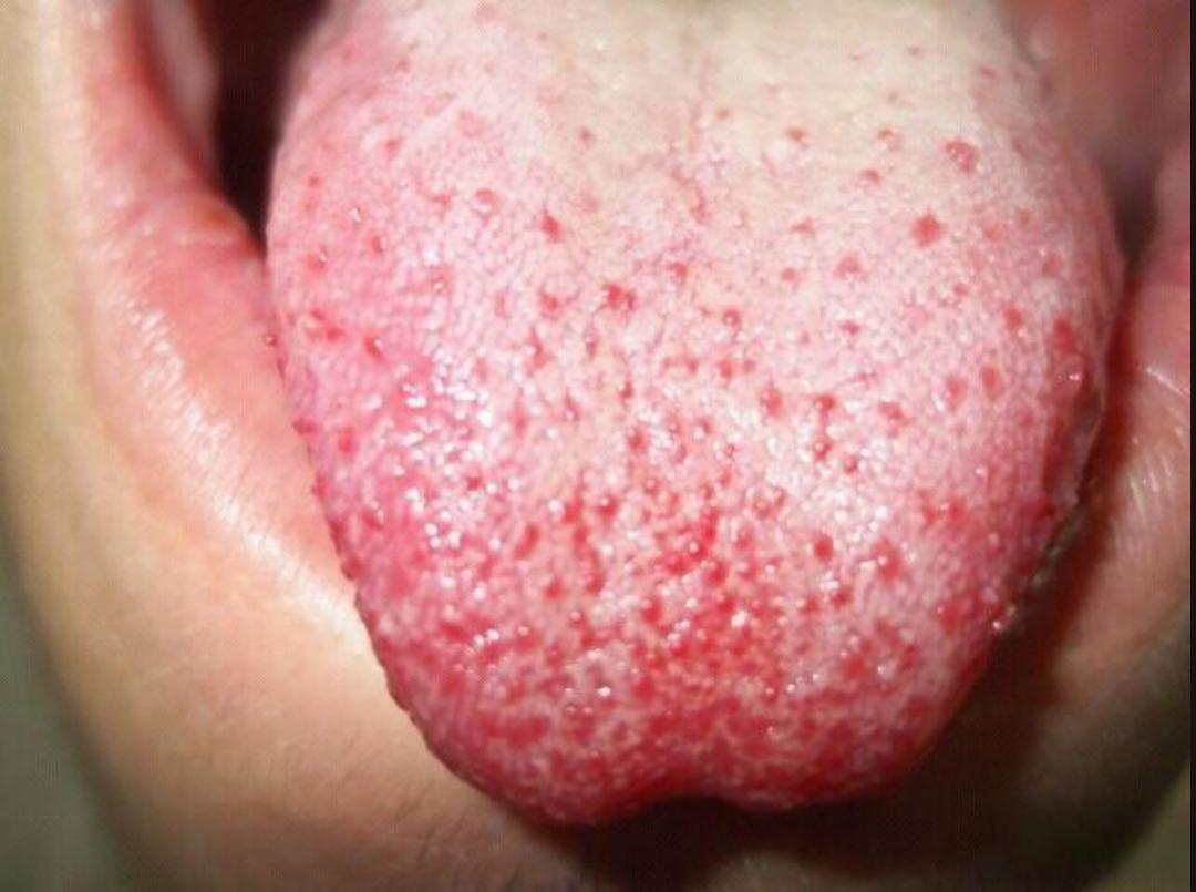 ⑤芒刺舌:舌面上有软刺(即舌乳头),正常情况下这是正常现象,但如果舌面软刺增大,高起如刺,触摸时感觉刺手,这种现象称为芒刺舌。这通常是由于邪热过盛引起的。芒刺的数量越多,邪热的程度越严重。根据芒刺出现的位置,可以判断热气所在的内脏,如舌尖有芒刺,通常是心火过盛;舌边有芒刺,通常是肝胆火盛;舌中有芒刺,通常是胃肠热盛。