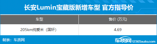 2026年1月22日,长安Lumin宝藏版新增车型——205km纯爱米正式上市,官方指导价4.69万元。作为全系入门车型,新车针对配置进行了调整,动力部分依旧搭载前置单电机,CLTC纯电续航里程205km。
