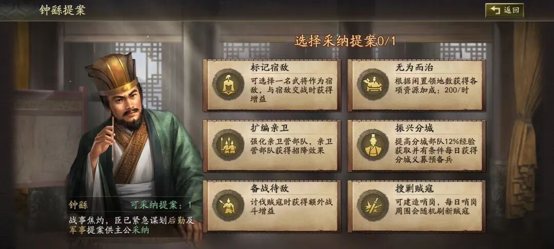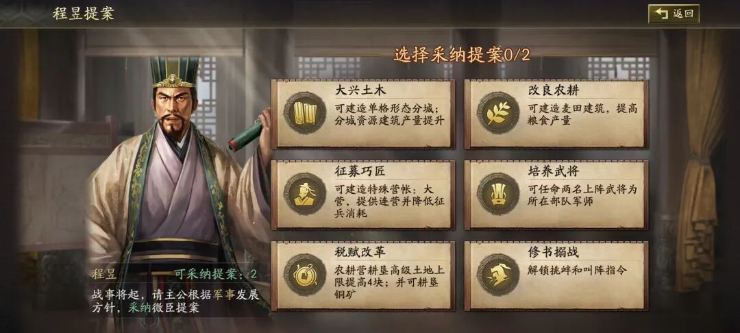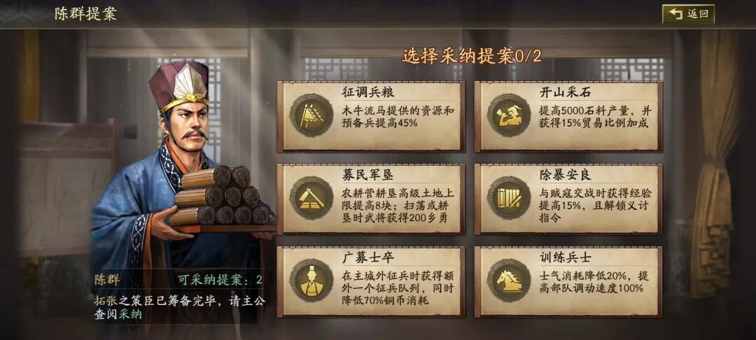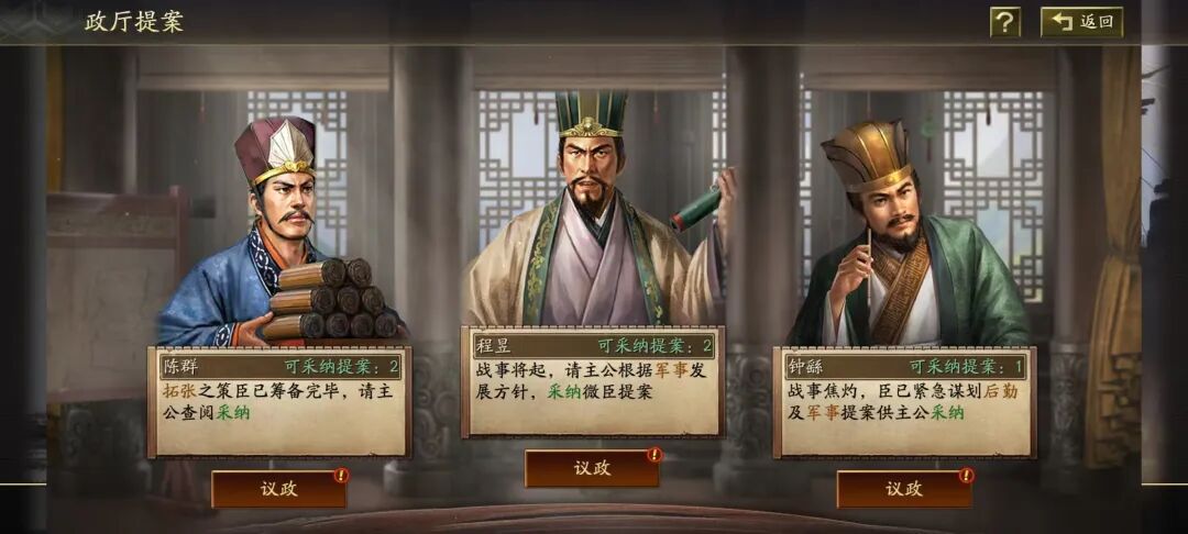 本赛季共三位文臣,分别是陈群、程昱、钟繇,每位文臣有6个提案,玩家可以从每个文臣的6个提案里面选2个提案使用,提案采纳后48小时可以重置,消耗50金珠。18项提案包括军事、内政、扩张等方向,玩家可以选择最喜欢的提案来享受加成。