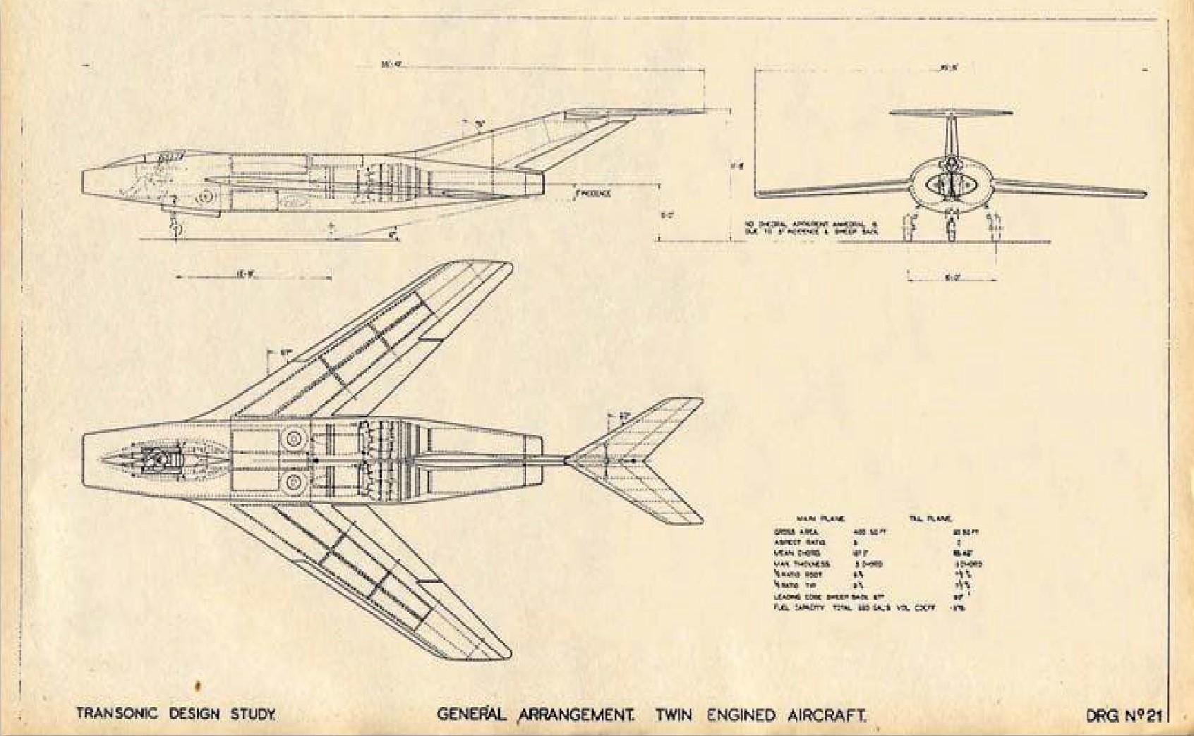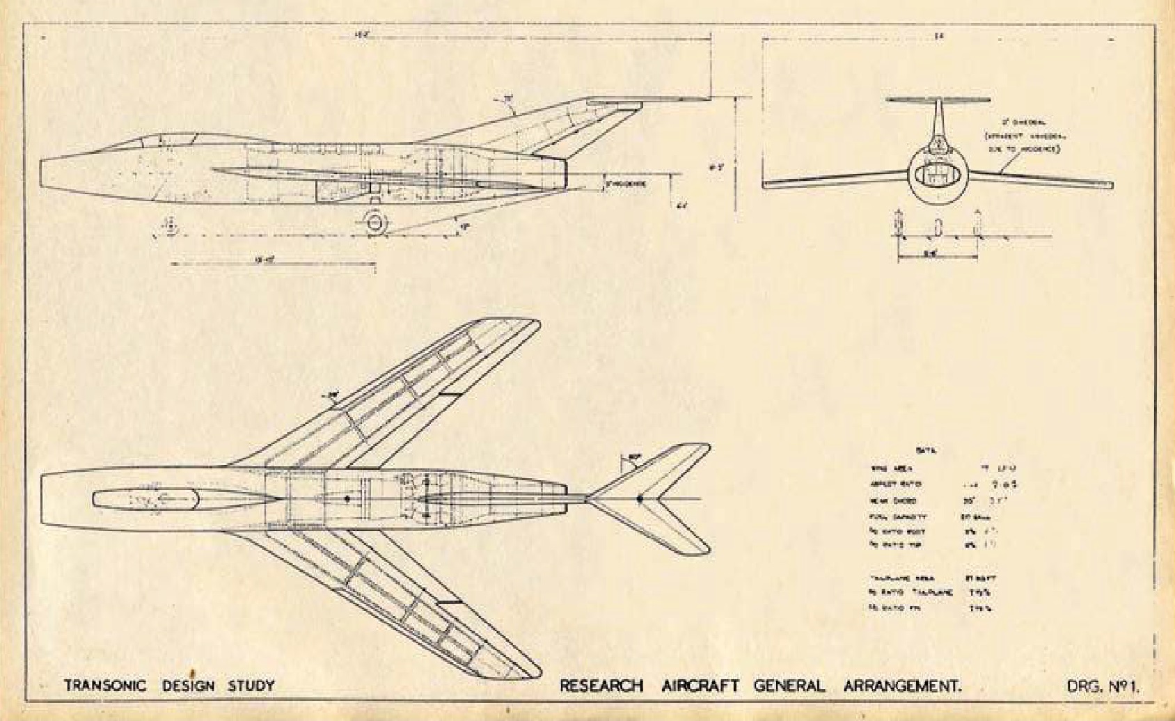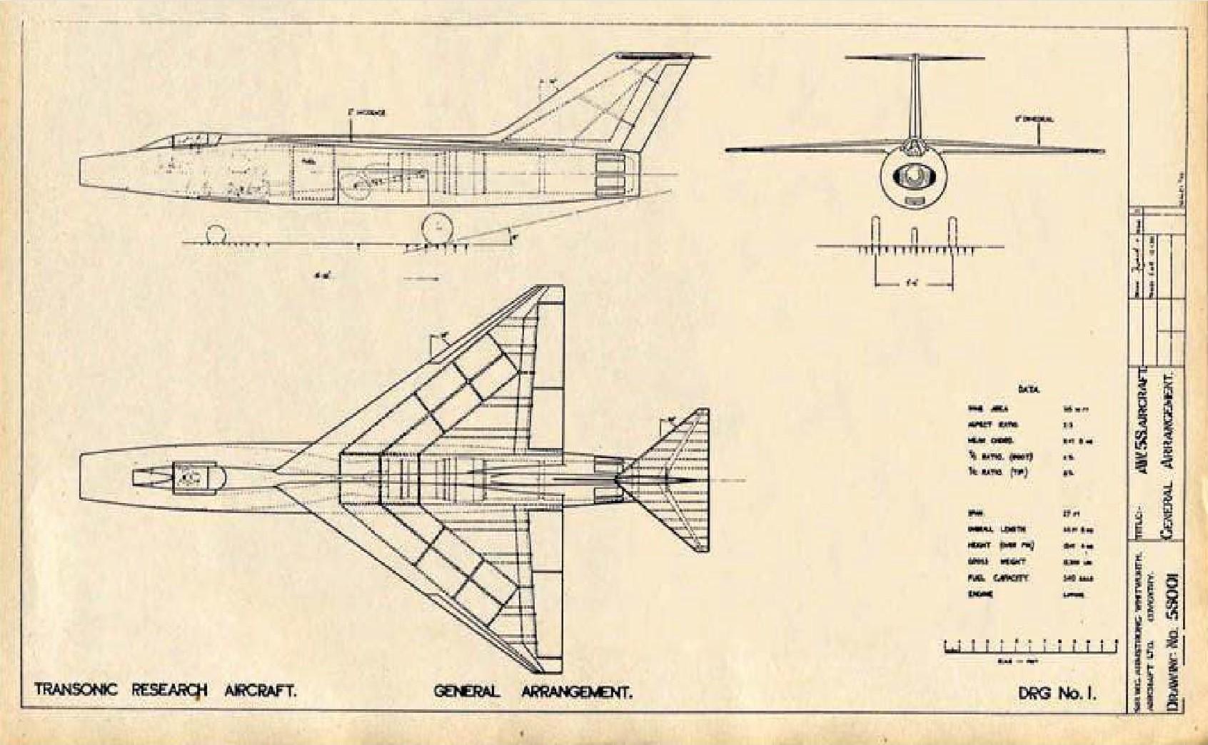 AWA 最初的手册在1948 年 8 月 3 日提交,手册中描述的实验飞机采用AVON动力,机翼面积小的后掠翼,机翼面积为 190 平方英尺(17.67 平方米),前缘后掠角为 59°,机翼的相对厚度为 8%,起飞重量约为 6,500 磅(2,950 公斤)。根据计算,这种布局在 56,000 英尺(17,000 m)高度水平飞行时将能够在不使用燃油加力系统的情况下达到 M = 1.1 的速度。