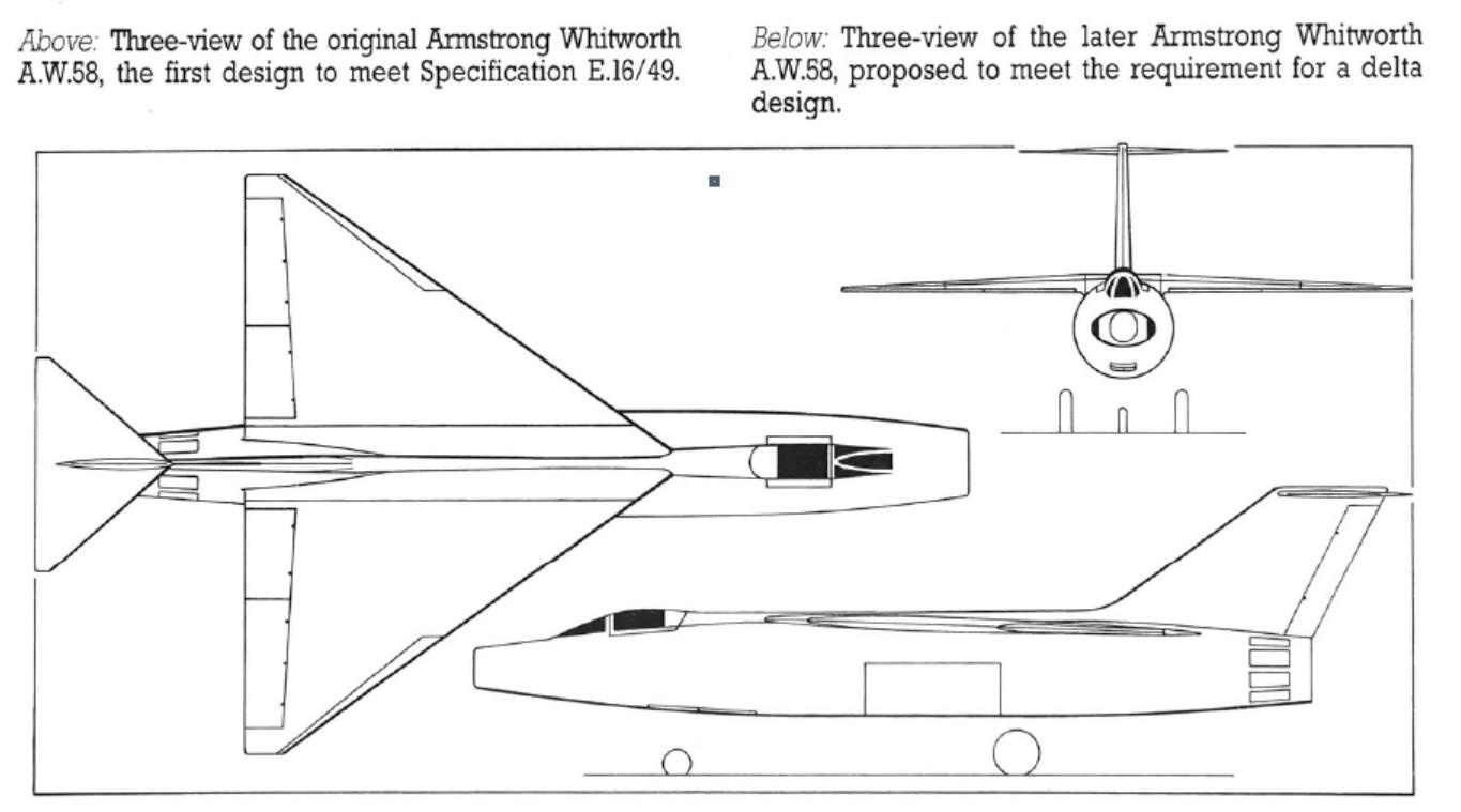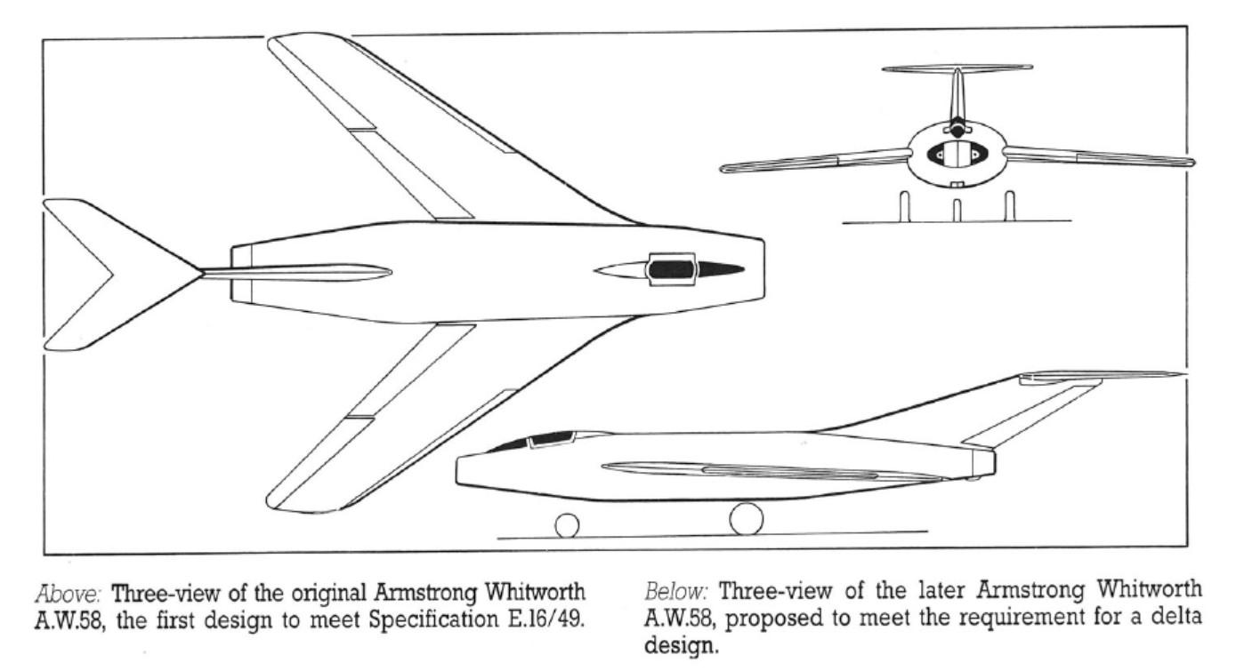 1950 年 1 月 23 日,AWA正式展示了关于超音速实验三角翼版本AW.58的小册子。这个新方案保留了后掠翼版本的机身设计,机翼调整为三角翼,并提高到机身上方。关于水平尾翼存在一些争论,开发团队强调平尾对于战斗机版本的重要性,因此保留了T尾翼上方的平尾。三角翼根部相对厚度为 5%,尖端相对厚度为 8%。内部燃料为 340 加仑(1546 升)。AWA的开发计划中会先创建 3/8 比例的空气动力学飞行模型,使用小号的阿姆斯特朗-西德利Adder 涡轮喷气发动机。