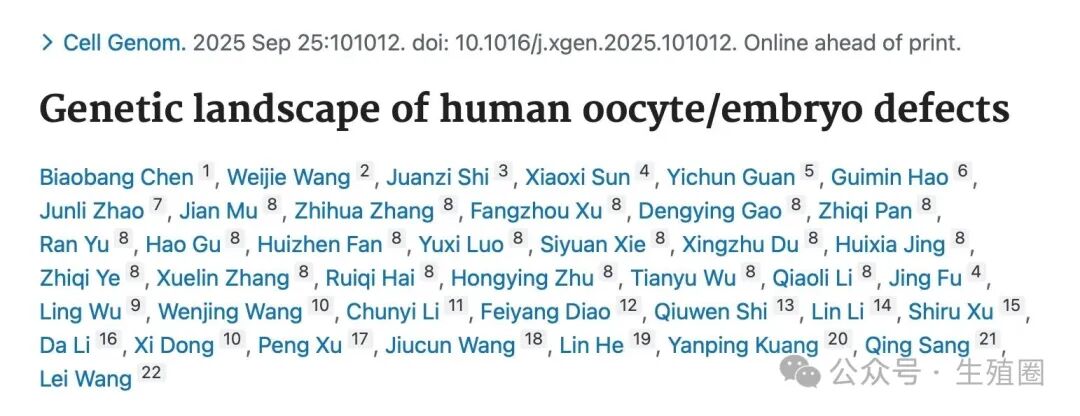 Genetic landscape of human oocyte/embryo defects. Cell Genom. 2025 Sep 25:101012. doi: 10.1016/j.xgen.2025.101012. Epub ahead of print.
