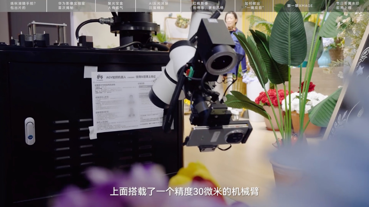 华为XMAGE影像科学实验室占地1100平米,内部搭建了31个标准化场景,从博物馆到花店应有尽有,宛如一个缩小版的“现实世界”。其中,一台自动化拍摄机器人尤为吸睛。它是一个定位精度在5mm的小车,搭载精度达30微米的机械臂,保障重复测试的高度一致性。它还可以模拟人物行走、弯腰等多种场景,可实现防抖、视频运镜等效果的自动化测试。