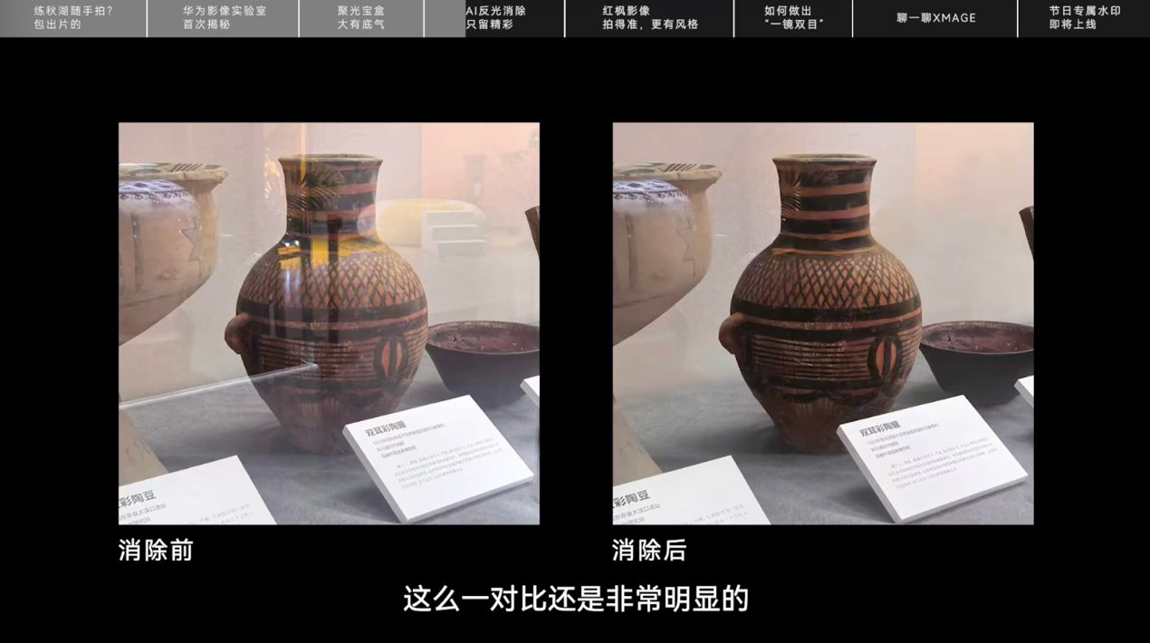 华为Pura 80系列还带来了基于AIGC大模型的AI去反光功能。它能够精准感知识别画面中的反光区域,并自动补全被反光遮挡部分的细节,让照片看起来就像没有玻璃阻隔。