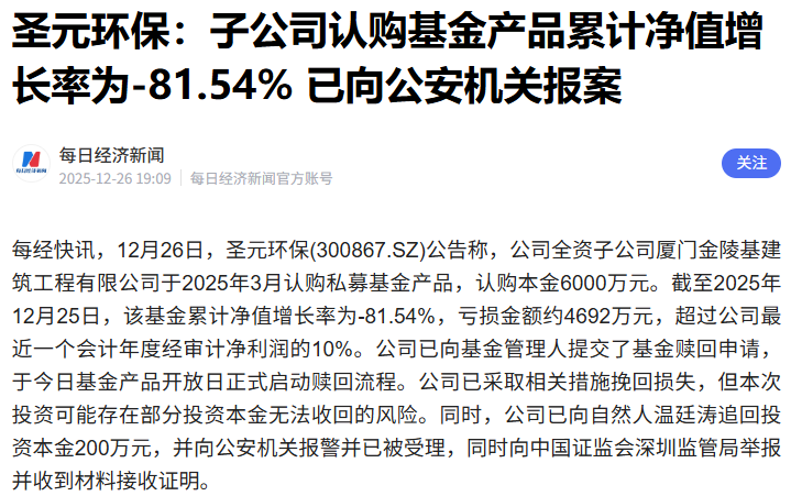 这事挺意思,该基金单位净值从12月4日的0.9215元骤降至0.2596元,一周内累计净值增长率从-7.85%扩大至-74.04%,净值从5529.00万元缩水至1557.69万元。截至12月25日,基金最新单位净值进一步跌至0.1846元,累计净值增长率为-81.54%,亏损金额约4692万元,已超过公司最近一个会计年度经审计净利润的10%。怎么亏的这么快,不知道踩什么雷上了……