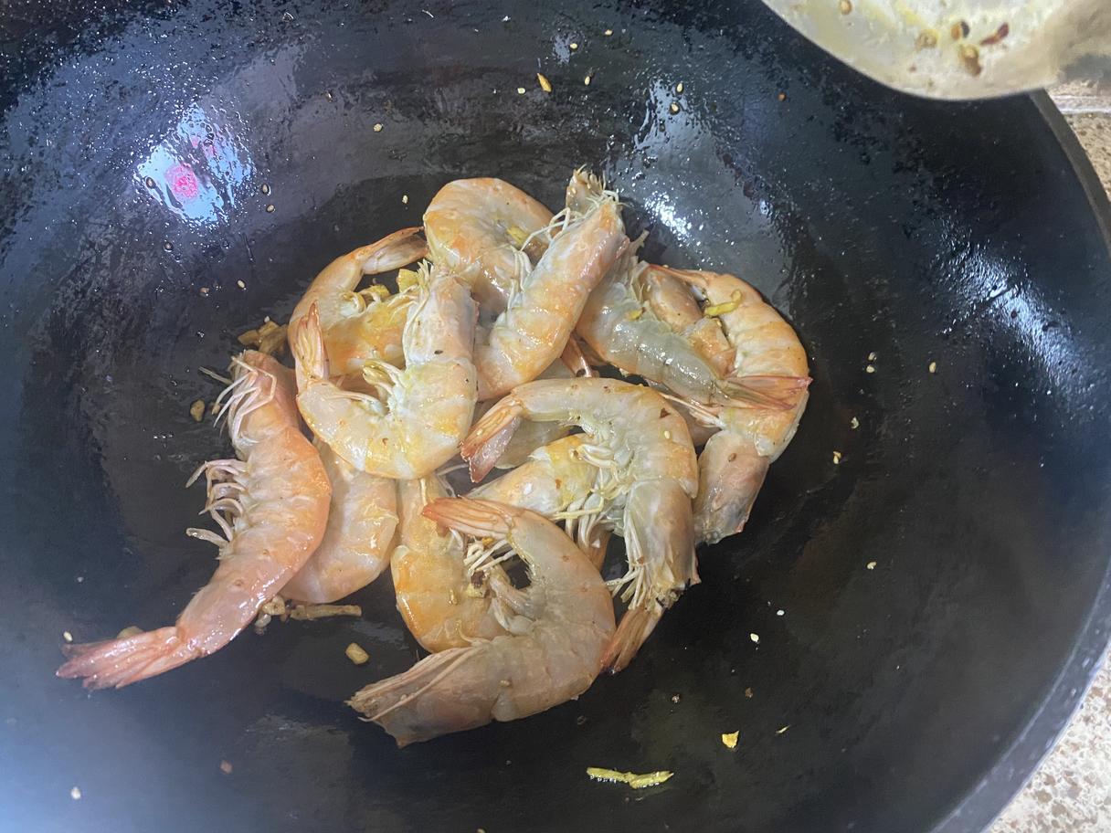 下虾烹煮:待底料香味充分释放后,将处理好的大虾倒入锅中,大火快速翻炒,使虾壳略微变色。
