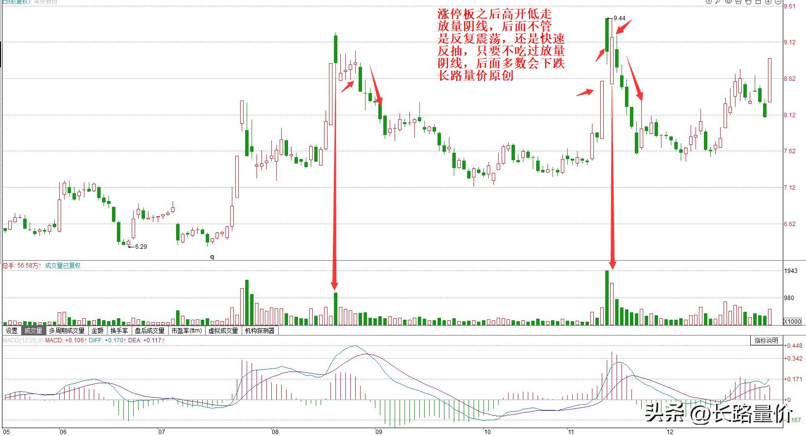 而在开板放量之后,有几种走势,一种是大阳线继续上涨,但是出现这种走势的比较少,一种是高开低走,还有就是冲高回落长上影线,基本上就是这么几种走势。
