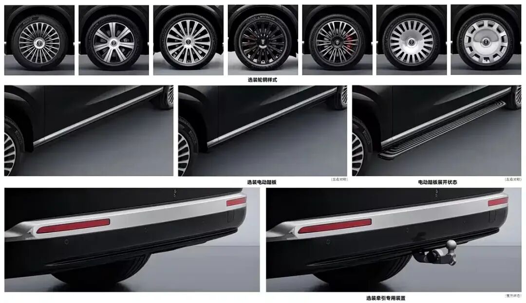 来到车身侧面,车窗周围用镀铬饰条加以装饰,在第三排车窗增加一处摄像头,并且换装尊界S800同款的星光门把手。在侧裙处也是使用镀铬饰条加以装饰,配备多幅式轮毂。