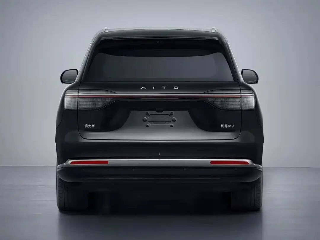 车身尾部,顶部配备高扰流板,尾窗的倾斜度比较大,采用贯穿式尾灯,在尾灯周围更是用熏黑加以处理,左尾灯下方为赛力斯标识,右尾灯下方为问界M9标识。后包围也是加入了镀铬装饰。