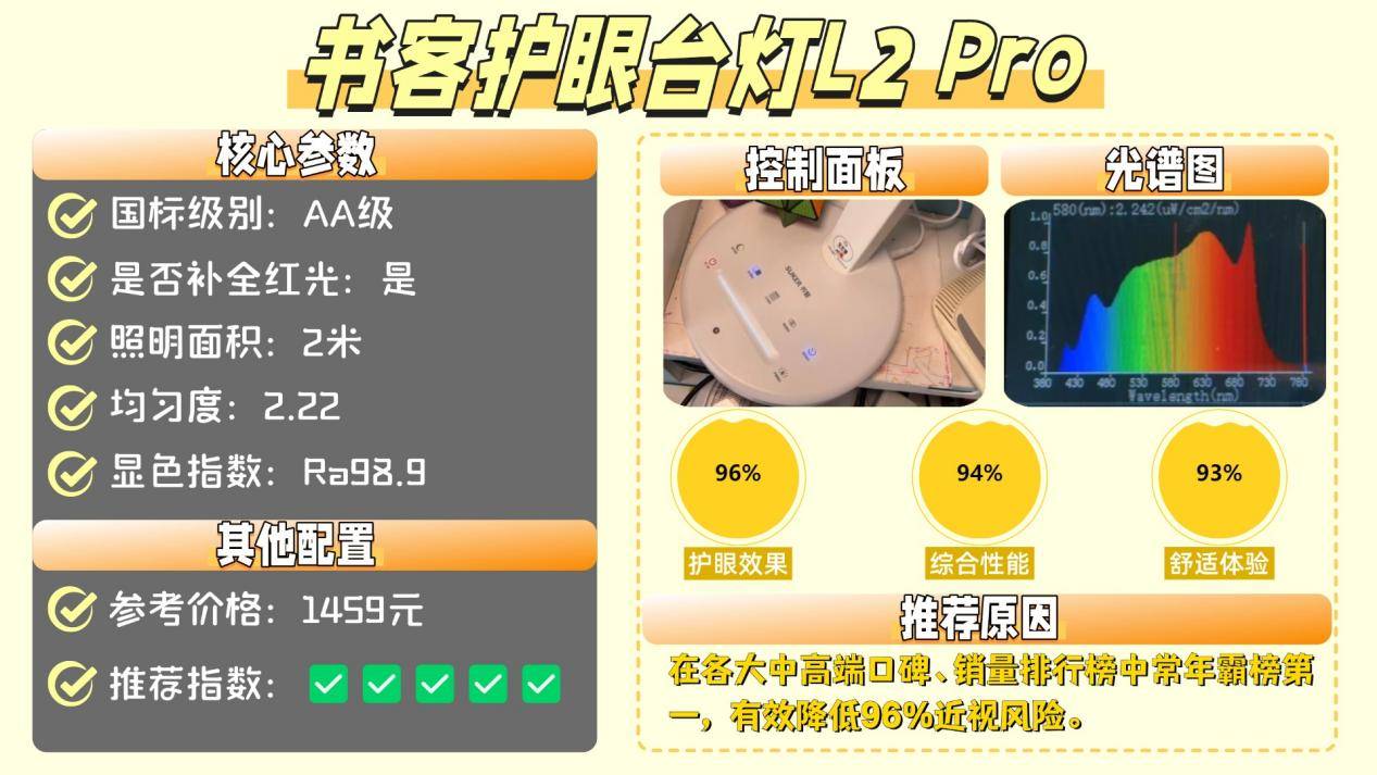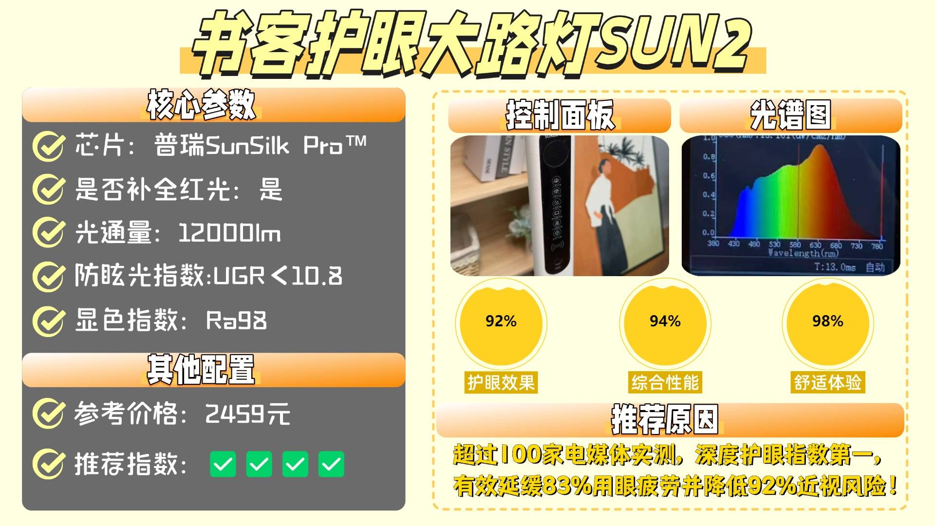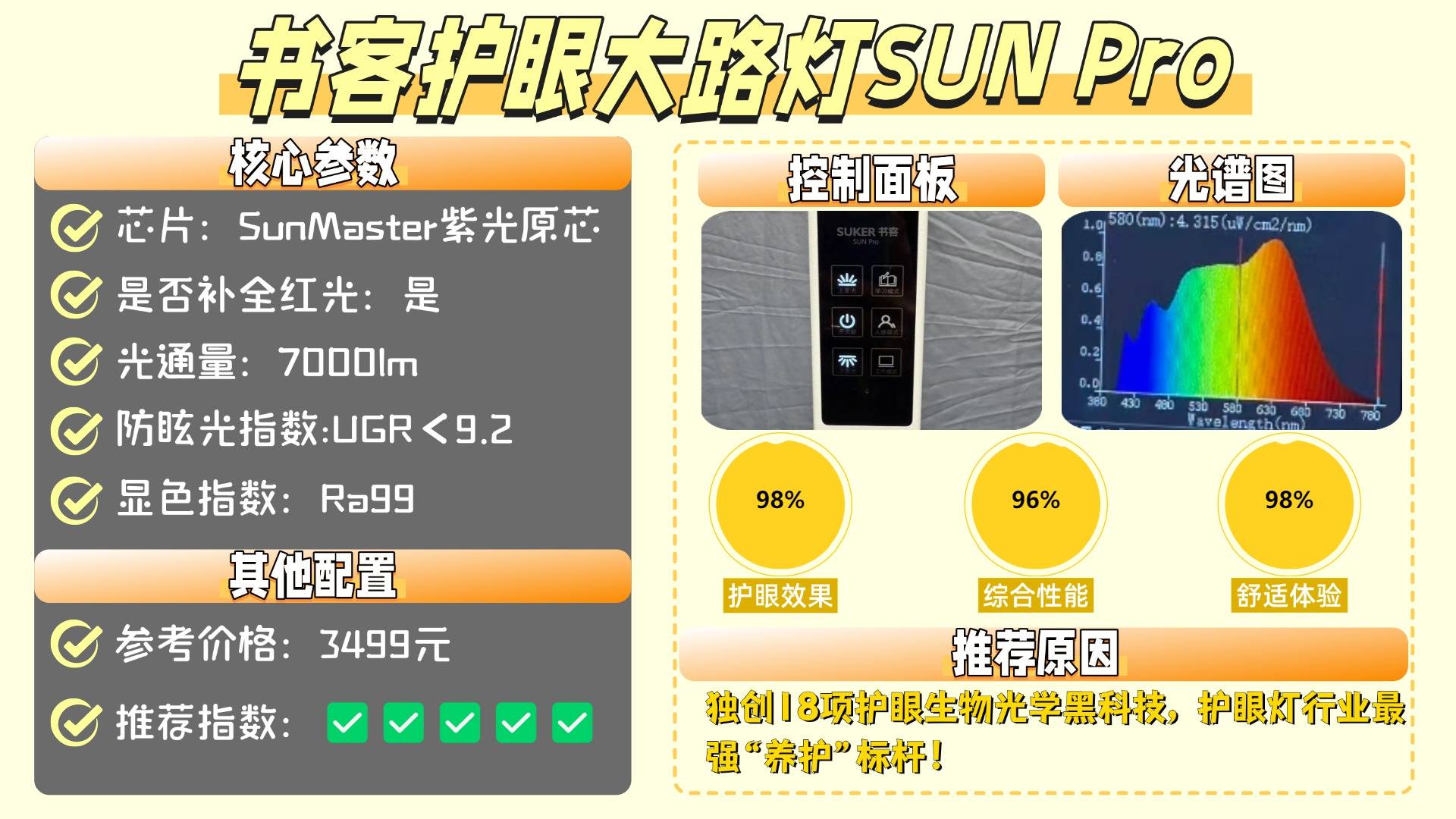 如果你有点预算,并且追求极致护养眼,那么书客SUN Pro是首选,这款护眼大路灯以强悍的抗衰减性、出色的护眼效果,罕见荣获CCTV展播推荐,并入选品牌强国优选工程,在安全护眼、光线均匀性、低蓝光控制等光学性能等方面,均为行业内最强!
