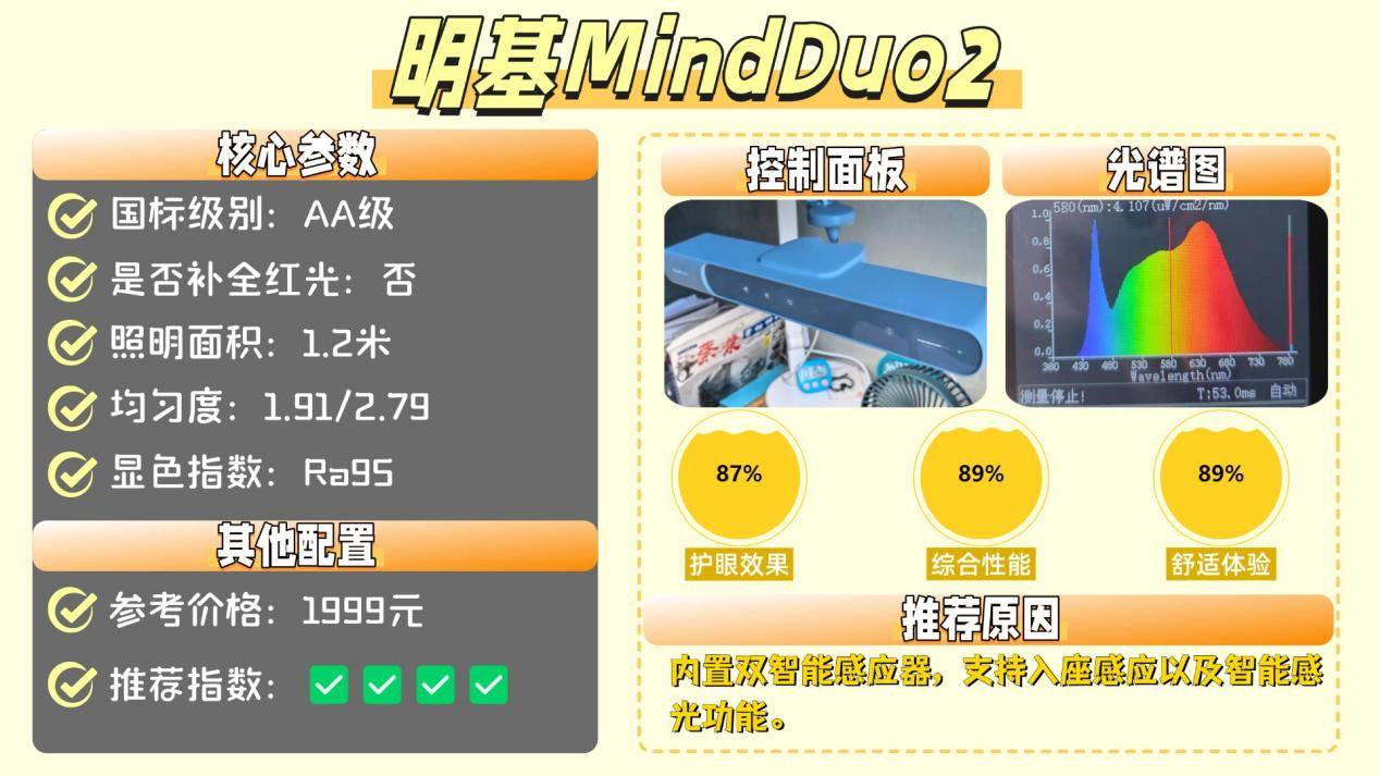 护眼效果:明基灯面采用了半遮挡式防眩光结构,有效避免光线直射眼部,右侧配备的可旋转物理旋钮,可精准控制亮度调节,兼顾科技感与实用性,在光学设计上,MindDuo2采用了“中心直发光+两侧反射光”的复合照明设计,中部导光板通过直射光强化阅读区照度,两侧反射光则弥补外围光线,整体照明覆盖更均衡,然而由于中心光强聚焦,若长时间直视,仍可能产生轻微刺眼感,并且实测蓝光比较高,红光波段缺失,影响着一定的护眼效果。