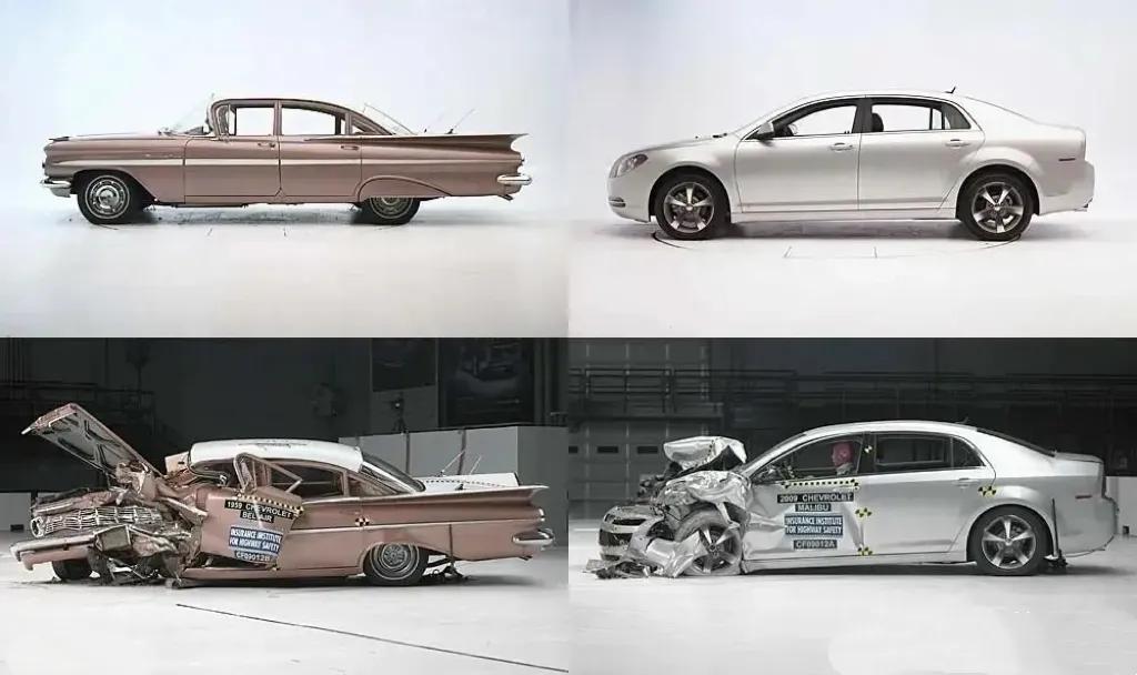 那么偏软的车头则是致命的,而另一方面则是技术方面的博弈,有没有必要为了保护对方而降低对车辆安全技术的投入?如上图所示美国IIHS举行的超时空碰撞测试,2009款雪弗兰迈锐宝 VS 1969款雪弗兰Bel air。结果一目了然1969款Bel air驾驶室损毁、AB柱全部发生断裂,2009迈锐宝完胜、但同样的“碰撞兼容性”被扣满8分。
