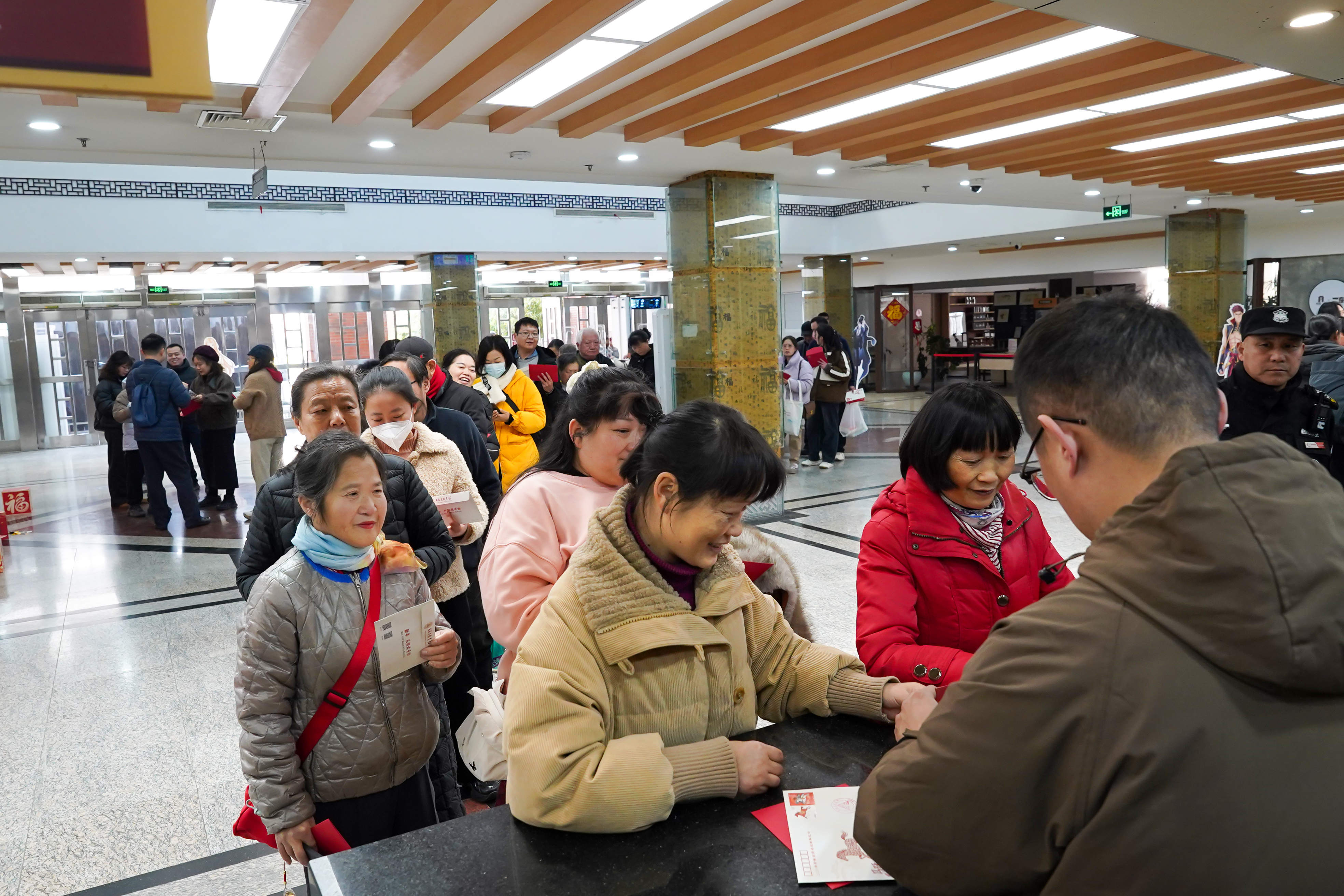 中午12时刚过,距离活动开始还有两个多小时,队伍已蜿蜒而出,近千名市民早早赶来,只为排队领取这份独特的“文化新春礼”。队伍中,既有裹着厚棉衣的老人,也有牵着孩童的家长,还有举着手机记录的年轻人。排在队伍前列的,是连续多年参加活动的严先生一家。“从第一届开始我们就来了,孩子从幼儿园排到了初中,几乎成为家里的年俗了。”严先生笑着说。手里的首日封,是他们家八年来集齐的“书香印记”。