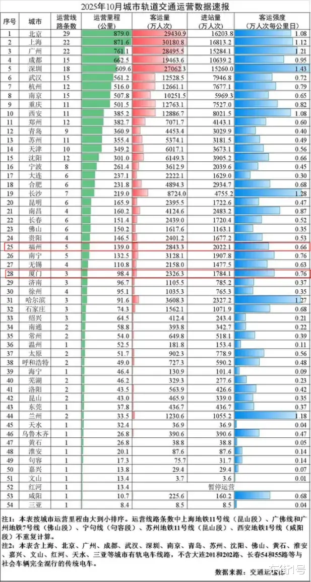 根据交通部数据,截至2024年年末,福州市开通运营5条地铁线路,运营里程139公里,车站90座。2024年全年,福州地铁的总客运量30569.2万人次,客流强度为0.6,远低于申报新一轮轨道要求的“运营初期客强需达到0.7”。(注:F1滨海快线为城际铁路,不纳入城轨运营数据)