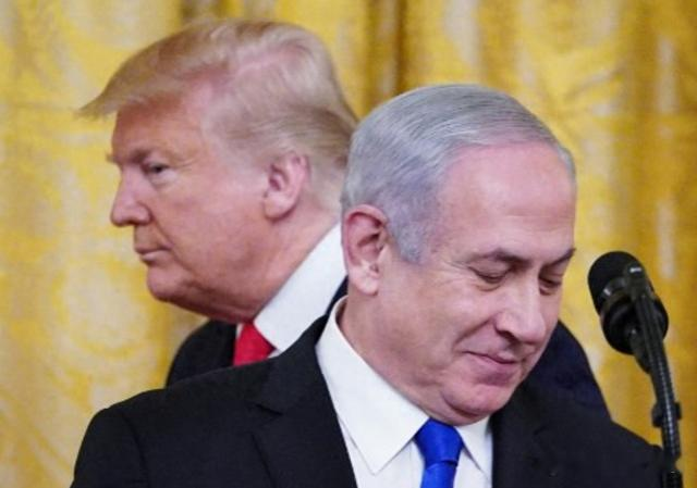 2020 年 1 月 28 日,美国总统唐纳德·特朗普和以色列总理在华盛顿特区白宫东厅宣布特朗普的中东和平计划。
