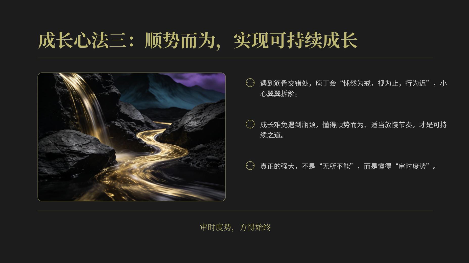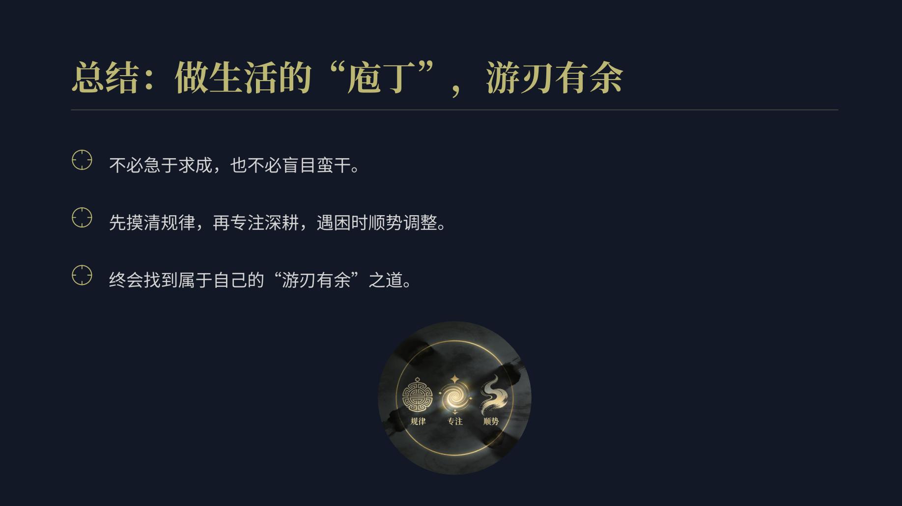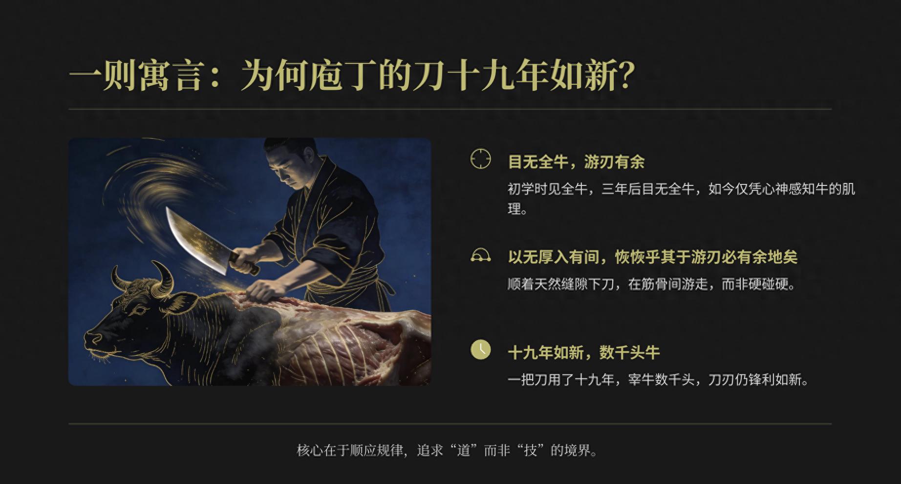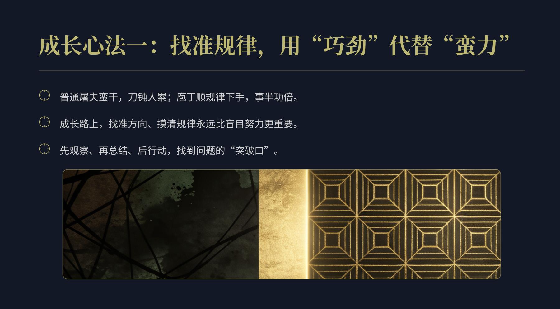 庖丁的核心智慧,是先花时间摸清牛的结构,再顺着规律下手。成长路上,找准方向、摸清规律永远比盲目努力更重要。