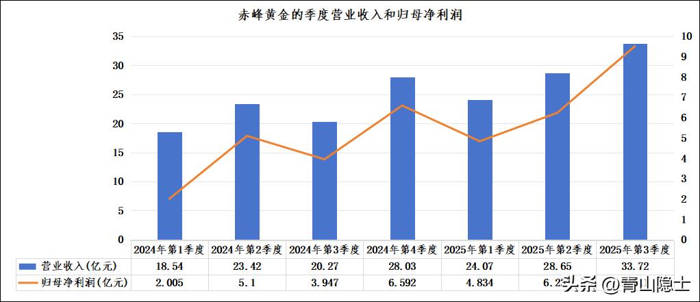 如下图所示,从2024年一季度至2025年三季度,赤峰黄金营业收入呈现稳步攀升的增长态势,整体经营规模实现显著扩容。2024年一季度公司营收仅为18.54亿元,此后各季度营收阶梯式上行,2024年四季度营收突破28亿元关口至28.03亿元,2025年以来营收增长节奏进一步加快,一季度营收为24.07亿元,二季度增至28.65亿元,到三季度已跃升至33.72亿元。从周期跨度来看,2025年三季度营收较2024年一季度增幅达81.88%,季度营收规模接近翻倍。