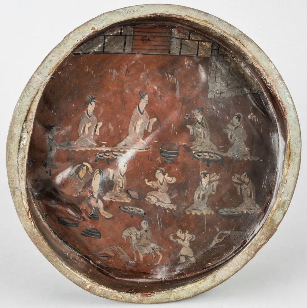 此件贵族生活图漆盘,直径24.8厘米,高3.5厘米,木胎制成。漆盘主要为彩黑、红二色,古朴典雅。其盘内、外颜色有所不同,内壁和底部涂红漆,外壁以及底部涂黑红漆。而盘中画面用色讲究层次和轮廓的勾勒,表现出三国时代吴地漆器彩绘的高超工艺。