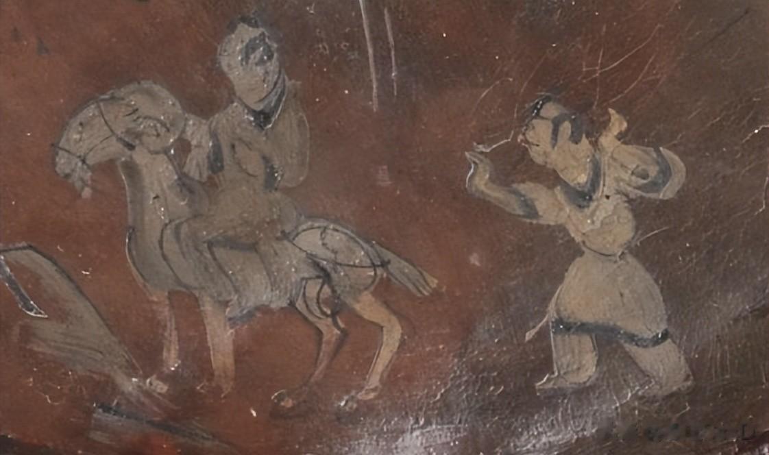 漆盘内的画面布局分明,盘内绘十二人,分为三层。上层为宴兵图,画面五人,其中四人跪坐宴饮。中部五人,一人对镜梳妆,二人对弈、二人驯鹰一小童侍立于旁中间画对弈图,两男子分坐两边,中间置一棋盘,前有矮足圆盘,上置食物。下层似为出游图,画面两人,一人骑马,一人跟于马后,前后有山岳。工匠用笔简练,以流畅的线条描绘出贵族生活的闲适惬意。