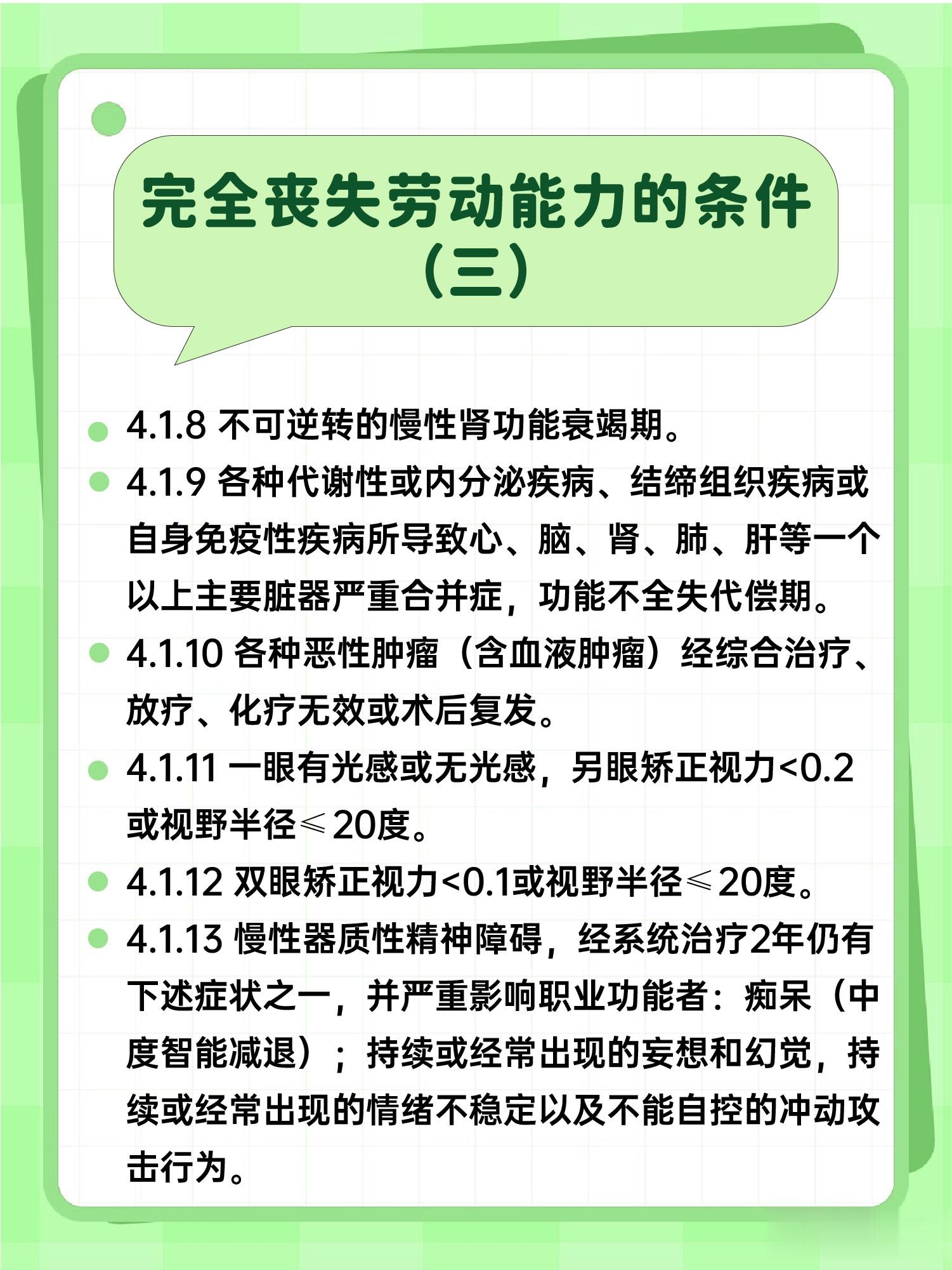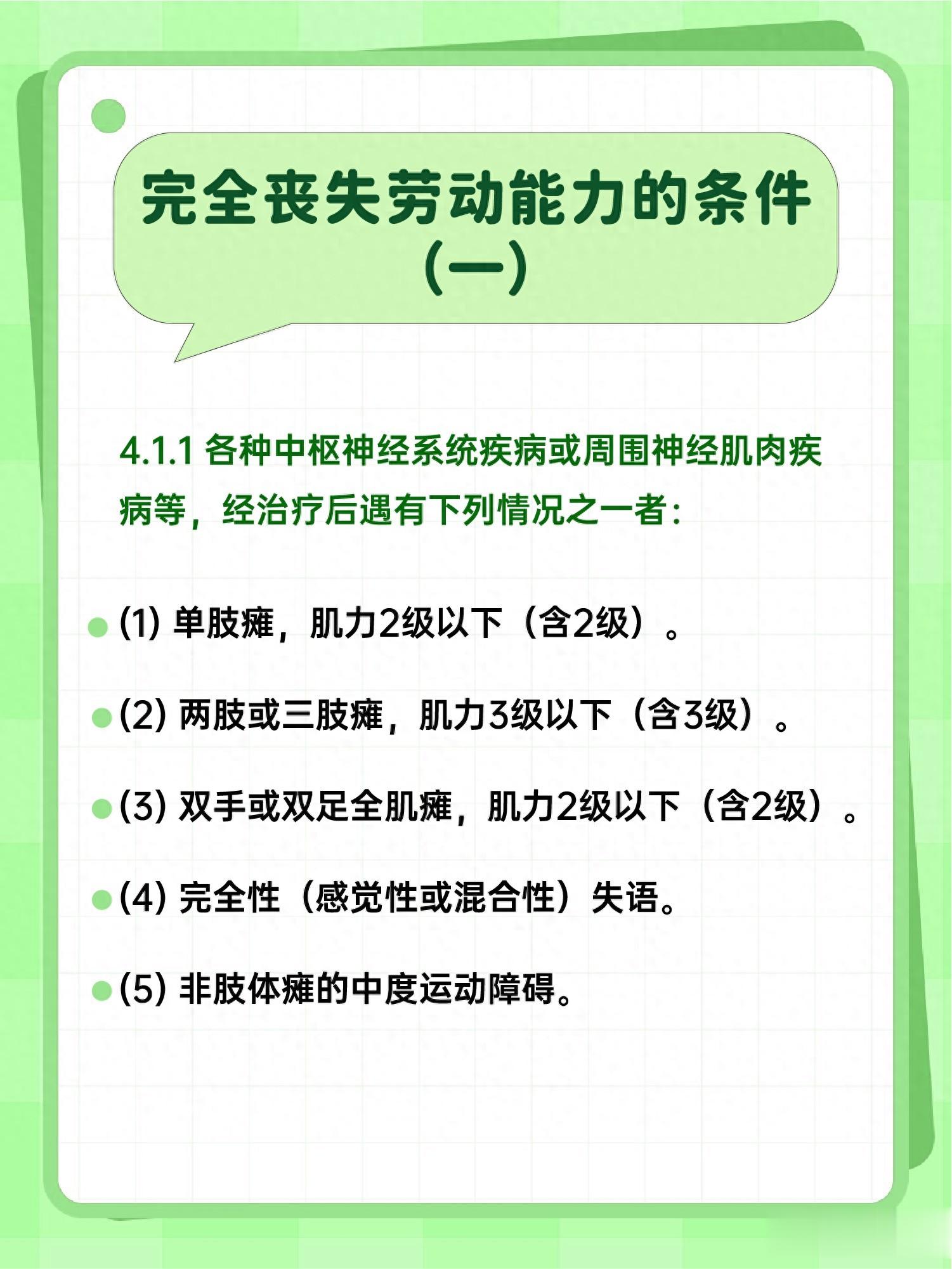 评论区问 "我这情况算完全丧失劳动能力吗" 的朋友们,其实国家早有明确标准!像恶性肿瘤经ZL无效、瘫痪肌力不达标、慢性肾衰晚期这些都在列。具体的医学判定标准和常见情形,右滑至图 2~图 6获取详情。需要附件的直接自取下载哦~