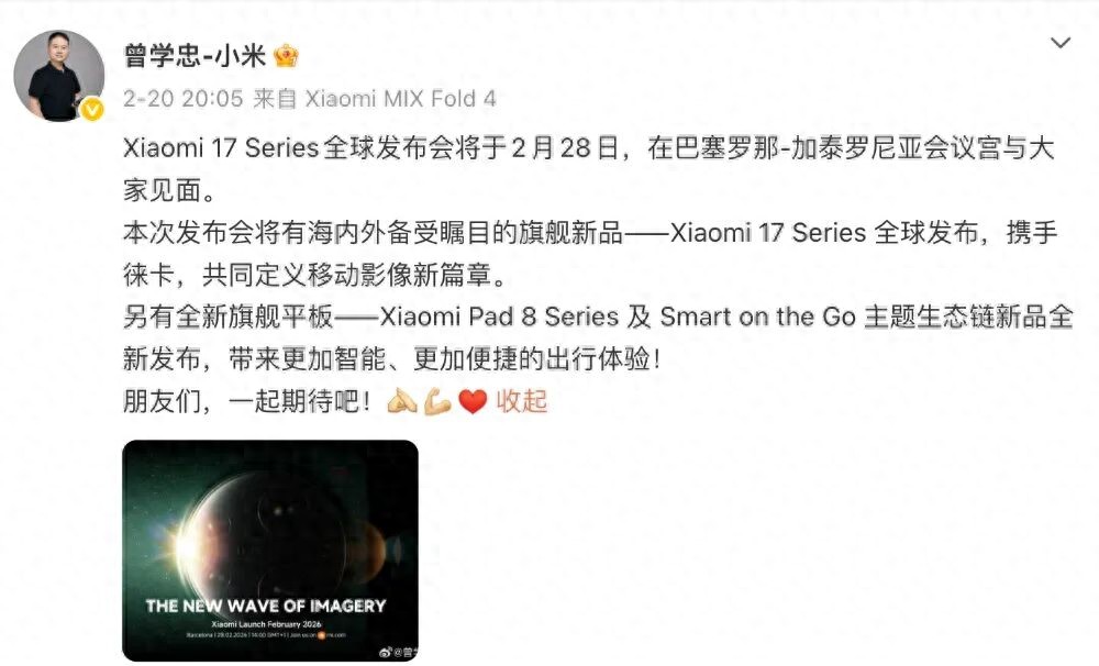 Xiaomi 17 Series全球发布会将于2月28日,在巴塞罗那-加泰罗尼亚会议宫与大家见面。