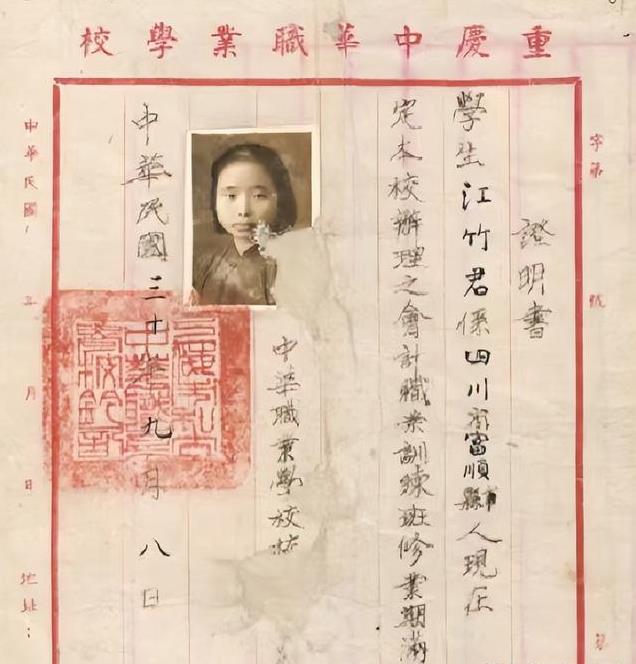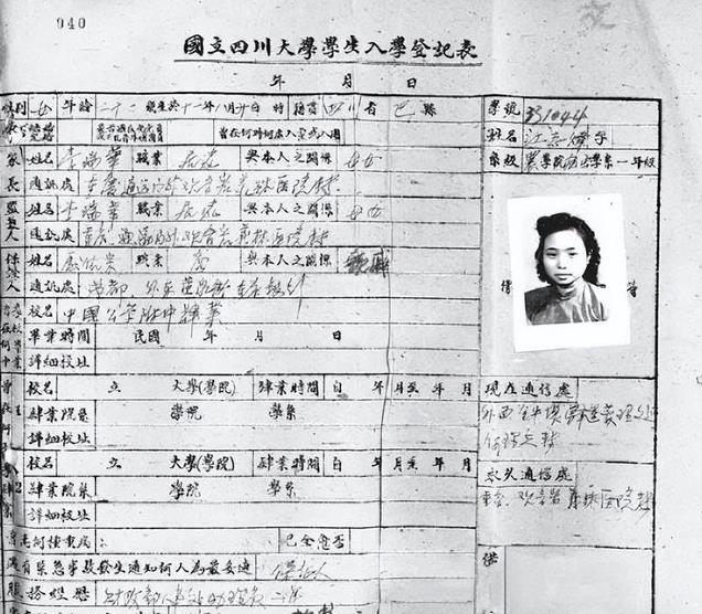这张照片是江竹筠进入四川大学的入学登记表,在1944年那年,江姐从重庆转移到成都,同年进入四川大学农学院学习,登记表中的江姐,梳着利落的发型,看起来平易近人。