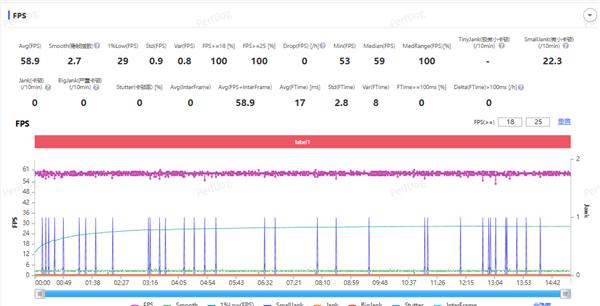 《原神》方面的表现也是相当优秀,最高画质60帧下,不仅能给出平均58.9FPS,稳帧指数2.7的近乎满帧的游戏体验,几次小型卡顿控制的也是极佳。